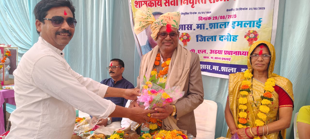 शिक्षा के क्षेत्र में अमूल योगदान प्रदान करने वाले, जिला शिक्षा केंद्र में एपीसी के पद पर रहकर शिक्षा में बहुमूल्य योगदान प्रदान करने वाले, मध्य प्रदेश सहायक शिक्षक संघर्ष संयुक्त मोर्चा के संरक्षक एवं मध्य प्रदेश शिक्षक कांग्रेस के जिला उपाध्यक्ष भाई श्री पी एल अठया प्रधानाध्यापक एकीकृत माध्यमिक शाला इमलाई के सेवानिवृत्ति के अवसर पर मध्य प्रदेश शिक्षक कांग्रेस के जिलाध्यक्ष श्री अमित सिंह , आदरणीय जिला शिक्षा अधिकारी एस के नेमा जी, विकासखंड शिक्षा अधिकारी वाय के कोरी जी, बीआरसी ललित रैकवार जी, डोमा परिसंघ जिला अध्यक्ष सरजू प्रसाद अहिरवार ने विदाई समारोह में सम्मिलित होकर उनके उज्जवल भविष्य एवं नव नूतन जीवन की शुभकामनाएं प्रदान की।