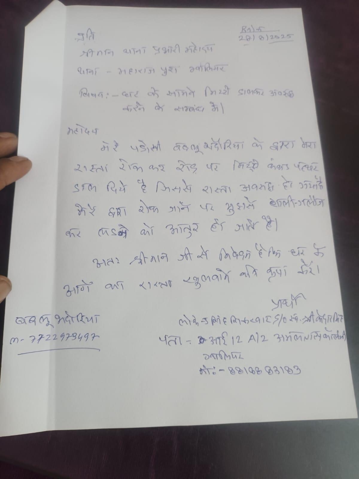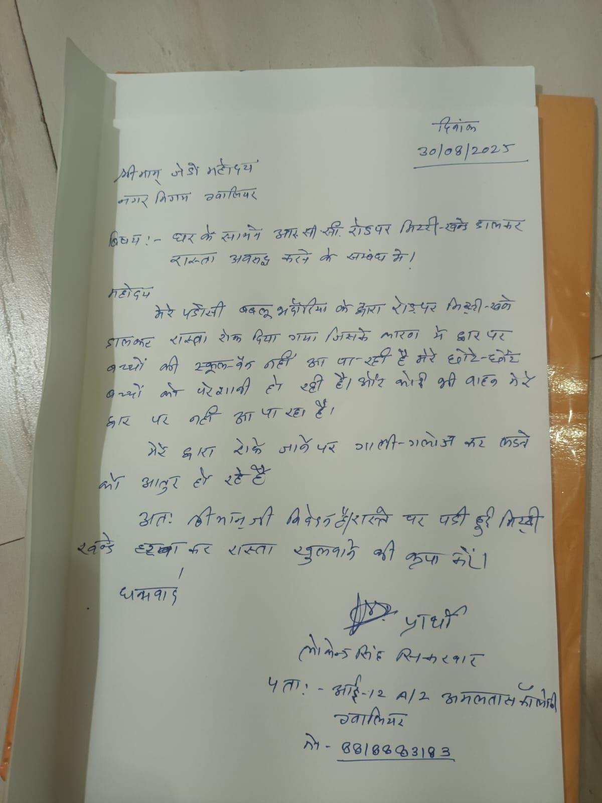 वार्ड क्र 19 अमलतास कॉलोनी ग्वालियर रोड पर दबंगों का कब्जा कॉलोनी वाले परेशान कॉलोनी में रहने वाले बब्लू भदोरिया द्वारा रोड पर अतिक्रमण कर रखा है इसकी शिकायत वार्ड क्रमांक 19 नगर निगम अधिकारियों से काई बार कर चुके हैं और थाना महाराजपुरा ग्वालियर को शिकायत कर चुके हैं कॉलोनी वासी काई दफे बब्लू भदौरिया से बोले तो वाह दमंगी दिखाकर लड़ै झगड़े करने को तैयार रहते हैं शासन प्रशासन द्वार अभी तक कोई कार्यवाही नहीं हुई है