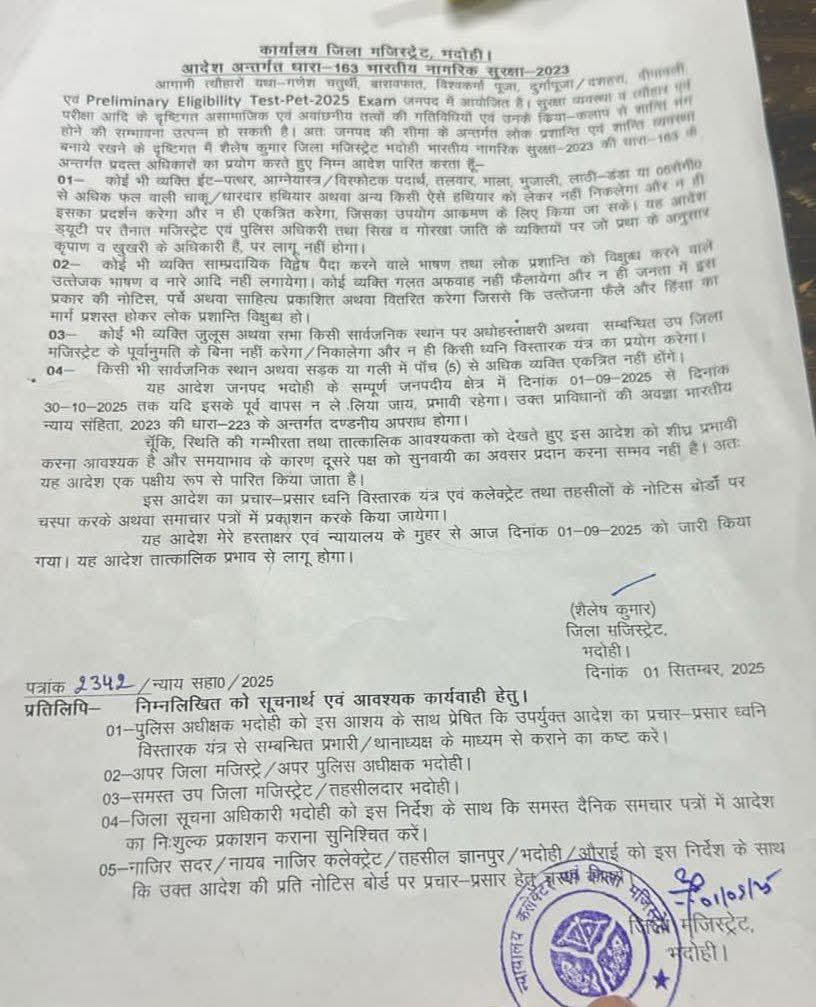 जनपद भदोही में जिलाधिकारी शैलेष कुमार द्वारा भारतीय नागरिक सुरक्षा अधिनियम-2023 की धारा-163 (किसी विशिष्ट अवधि के लिए लागू की जाने वाली सुरक्षा व्यवस्था) को 1 सितंबर 2025 से लेकर 30 अक्टूबर 2025 तक लागू करने का आदेश जारी किया गया है। यह आदेश त्यौहारों — जैसे गणेश चतुर्थी, बारावफात, विश्वकर्मा पूजा, दुर्गा पूजा, दशहरा और दीपावली — के दौरान शांति और कानून-व्यवस्था बनाए रखने के उद्देश्य से लिया गया है।