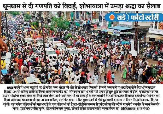 छबड़ा, अनंत चतुर्दशी के दिवस पर श्री गणेश कला मंडल की ओर से निकाली गई शोभा यात्रा जिसमें कलाकारों और अखाड़ेबाजों वालों ने हेरतअंगेज कर्तव्य दिखाएं