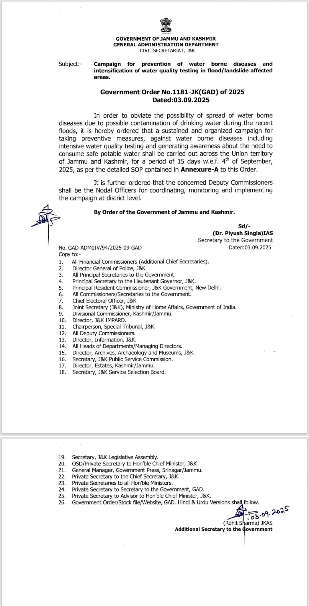 Government of Jammu and Kashmir has issued order Regarding Campaign for prevention of water borne diseases.