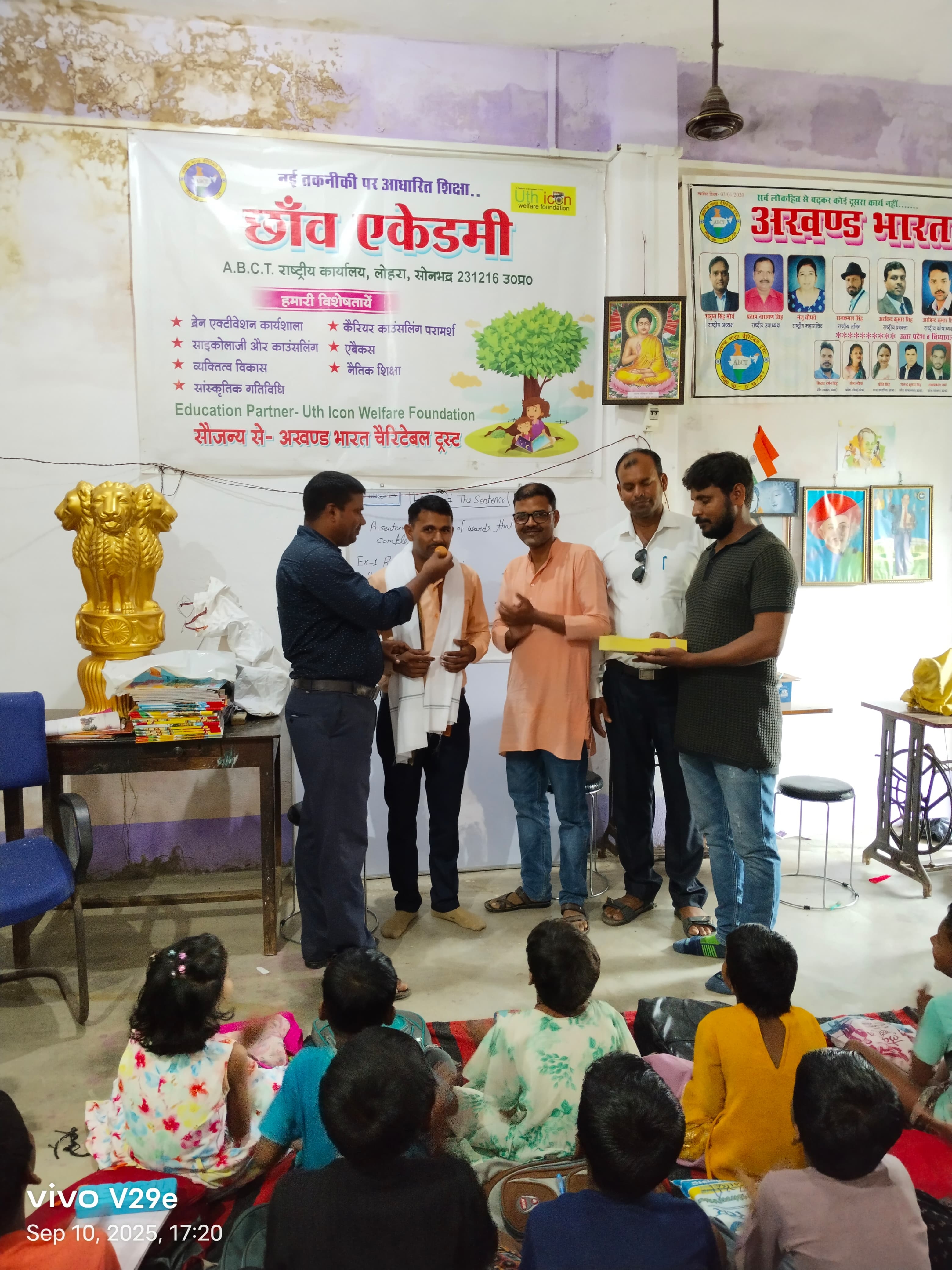 अखण्ड भारत चैरिटेबल ट्रस्ट द्वारा संचालित निःशुल्क कोचिंग सेंटर छांव एकेडमी 2 (लोहरा पम्पवा बस्ती सोनभद्र) में रिंकू मौर्य जी के द्वारा अपना जन्मदिन मनाया गया। इस दौरान उनके द्वारा अपने जन्मदिन पर नि:शुल्क कोचिंग सेंटर छांव एकेडमी के लगभग 90 बच्चों में उच्च कोटि की कापी , कलम का वितरण किया गया तथा मिठाई खिलाई गई।समस्त संस्था परिवार की तरफ से इस नेक कार्य के लिए रिंकू मौर्य जी को बहुत बहुत साधुवाद। अखण्ड भारत चैरिटेबल ट्रस्ट से जुड़कर एक उज्जवल राष्ट्र के निर्माण में किए गए नेक कार्य के लिए बहुत बहुत आभार। जय अखण्ड भारत