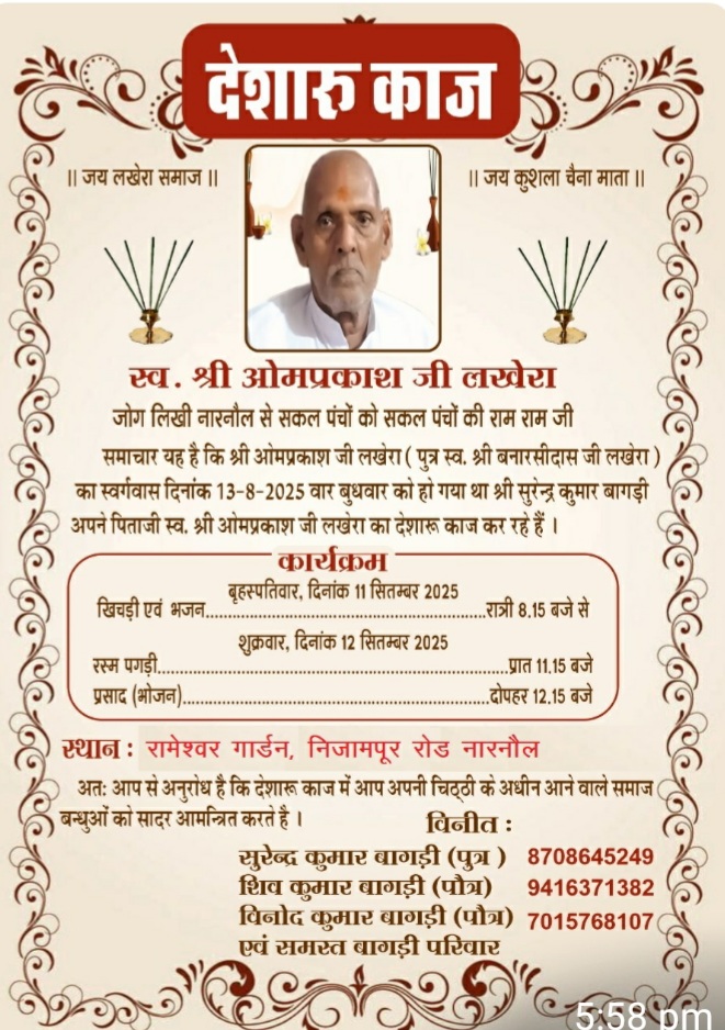 जोग लिखी नारनौल से सकल पंचों को सकल पंचों की राम राम जी समाचार यह है कि श्री ओमप्रकाश जी लखेरा (पुत्र स्व. श्री बनारसीदास जी लखेरा) का स्वर्गवास दिनांक 13-8-2025 वार बुधवार को हो गया था श्री सुरेन्द्र कुमार बागड़ी अपने पिताजी स्व. श्री ओमप्रकाश जी लखेरा का देशारू काज कर रहे हैं।
