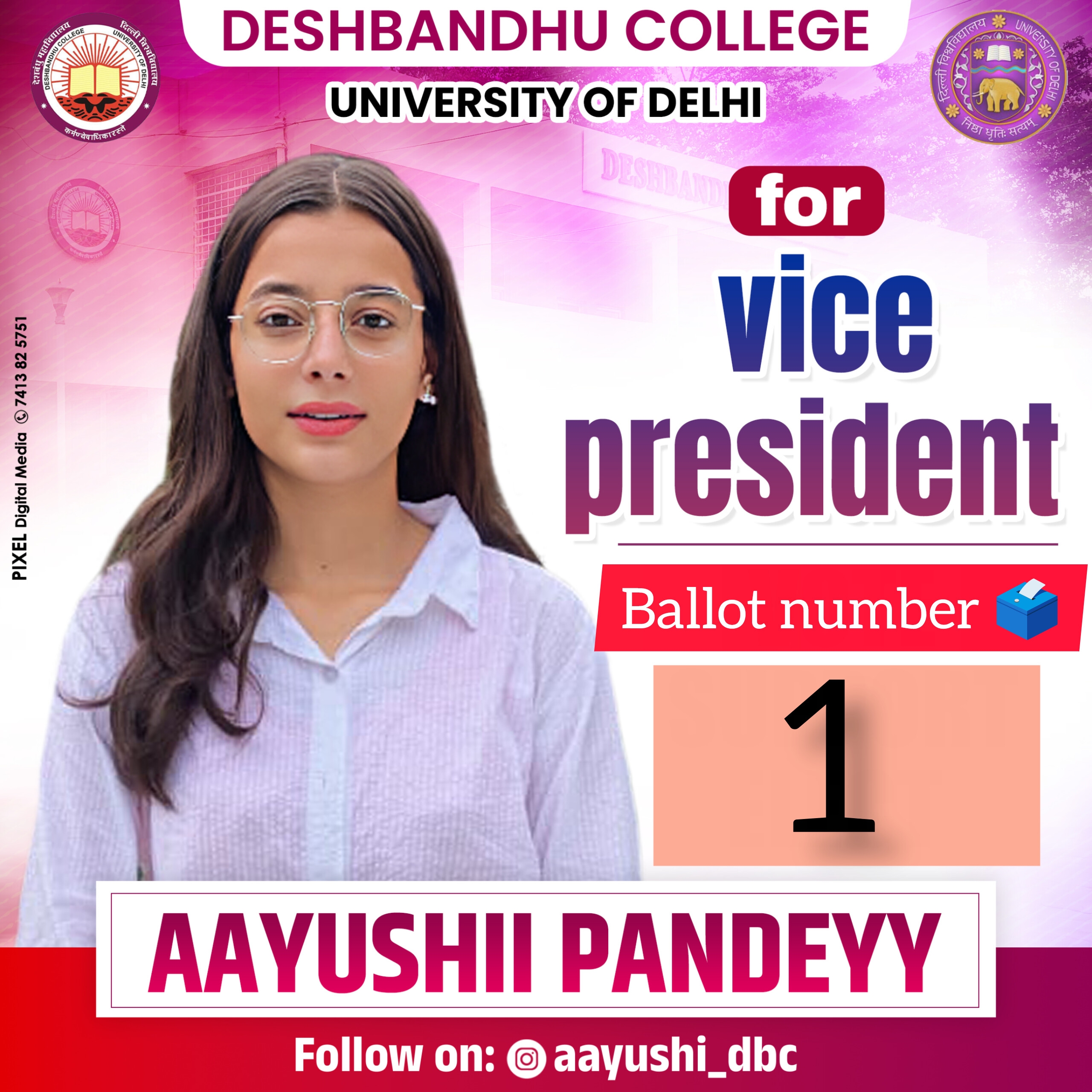 नई दिल्ली। देशबंधु कॉलेज छात्रसंघ चुनाव इस बार काफी रोचक हो गया है। कॉलेज की राजनीतिक विज्ञान (ऑनर्स) की छात्रा आयुषी पांडेय ने उपाध्यक्ष पद के लिए अपनी दावेदारी पेश की है। उनका नाम मतपत्र पर बैलेट नं. 1 पर दर्ज है, जिससे उन्हें छात्रों के बीच एक अलग पहचान मिल रही है।