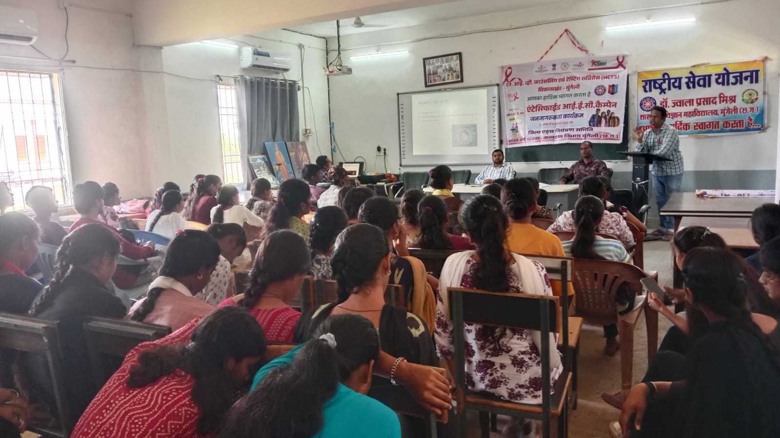 मुंगेली)//छत्तीसगढ़//डॉ ज्वाला प्रसाद मिश्र शासकीय विज्ञान महाविद्यालय मुंगेली के रासेयो ईकाई द्वारा 13.9.25 को रेड रिबन कार्यक्रम अन्तर्गत एड्स जागरूकता कार्यक्रम , शपथ का आयोजन किया गया जिसमें मुख्य अतिथि राज्य एड्स नियंत्रण समिति मुंगेली के प्रभारी दिलीप बसंत सर जी एवं विशिष्ट अतिथि श्री एन के पुरले जिला संगठक रासेयो, कार्यक्रम अधिकारी श्री सुरेश कुमार भारती, सहायक प्राध्यापक श्री रामचरण साहू, डॉ रमाकांत चंद्राकर, कुमारी मानसी लैब तकनीशियन की, विद्यार्थी स्वयं सेवक की गरिमामई उपस्थिति में सम्पन्न हुए कार्यक्रम में जरा सी गलती मूवी दिखाई गई तथा उद्बोधन में परामर्शदाता दिलीप बसंत सर ने एड्स के कारण बचाव, संक्रमित मरीज से व्यवहार और जागरुकता के बारे में विस्तृत जानकारी दिए इसी कड़ी में जिला संगठक श्री एन के पुरले द्वारा एड्स चार कारणों से फैलता है, संक्रमित व्यक्ति से असुरक्षित संबंध से, संक्रमित सुई के प्रयोग से, संक्रमित माता से बच्चे को, संक्रमित व्यक्ति के रक्तदान से के बारे में बताए तथा जानकारी ही बचाव है कहे इसी कड़ी में प्रोफेसर एस के भारती द्वारा एड्स एच आईं वी वायरस, एड्स के रोकथाम के उपाय राज्य एड्स नियंत्रण समिति के कार्य के बारे में जानकारी दिए तथा विद्यार्थियों द्वारा इस संबंध में अपना विचार साझा किए कार्यक्रम का संचालन कार्यक्रम अधिकारी श्री सुरेश कुमार भारती द्वारा किया गया एवम आभार प्रदर्शन श्री रामचरण साहू ने किए।