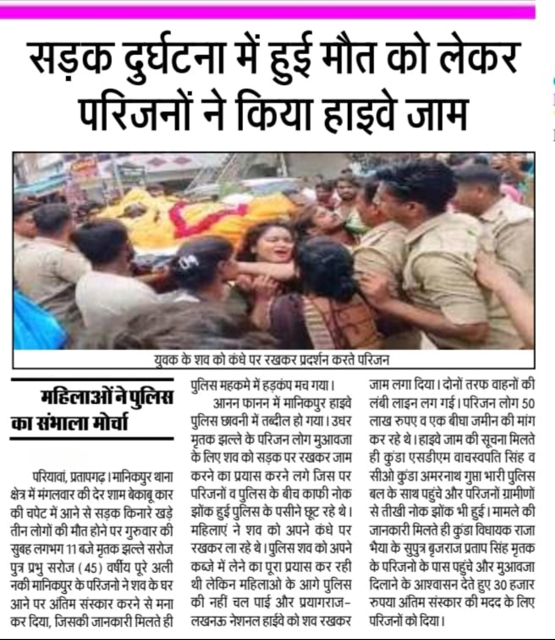 बीते बुधवार को कुंडा प्रतापगढ़ के मानिकपुर में मीरगढ़वा चौराहा पे अनियंत्रित कार के दुर्घटनाग्रस्त होने के कारण मृतक परिवार जनों ने मृतक के शव के साथ लखनऊ प्रयागराज हाइवे को जाम कर दिया और 5 लाख तथा 1 बीघा जमीन की मांग रखी।