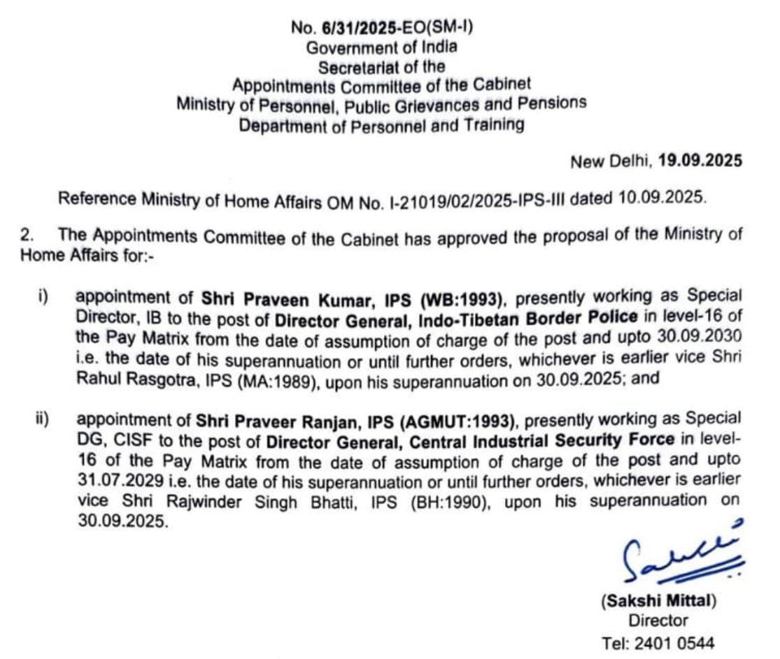 पश्चिम बंगाल कैडर के 1993 बैच के आईपीएस प्रवीण कुमार, जो फिलहाल आईबी में स्पेशल डायरेक्टर हैं, को #ITBP का डीजी लगाया गया है।AGMUT कैडर के 1993 बैच के IPS प्रवीर रंजन को #सीआईएसएफ का डीजी लगाया गया है।