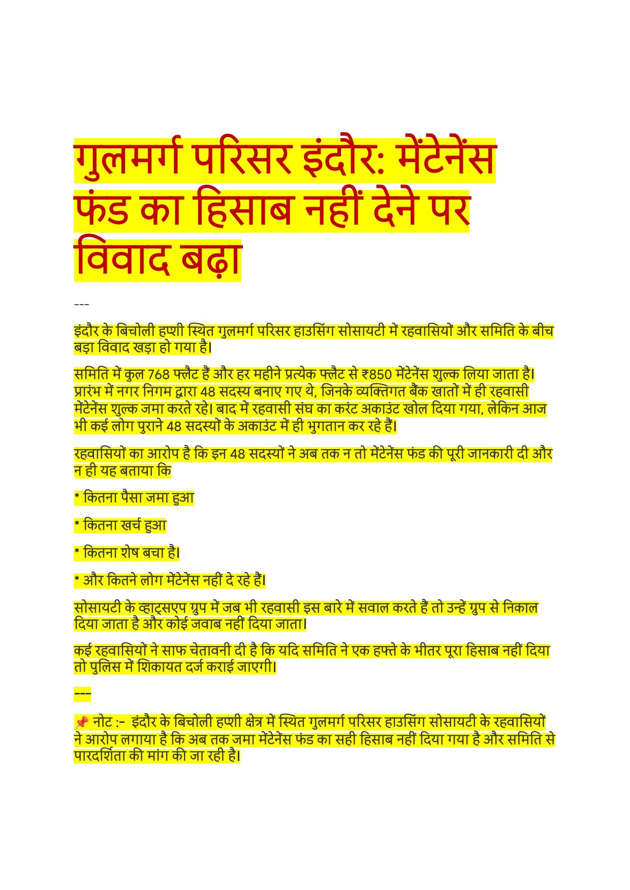 इंदौर के बिचोली हप्सी क्षेत्र में स्थित गुलमर्ग परिसर हाउसिंग सोसायटी के रहवासियों ने आरोप लगाया है कि अब तक जमा मेंटेनेंस फंड का सही हिसाब नहीं दिया गया है और समिति से पारदर्शिता की मांग की जा रही है।