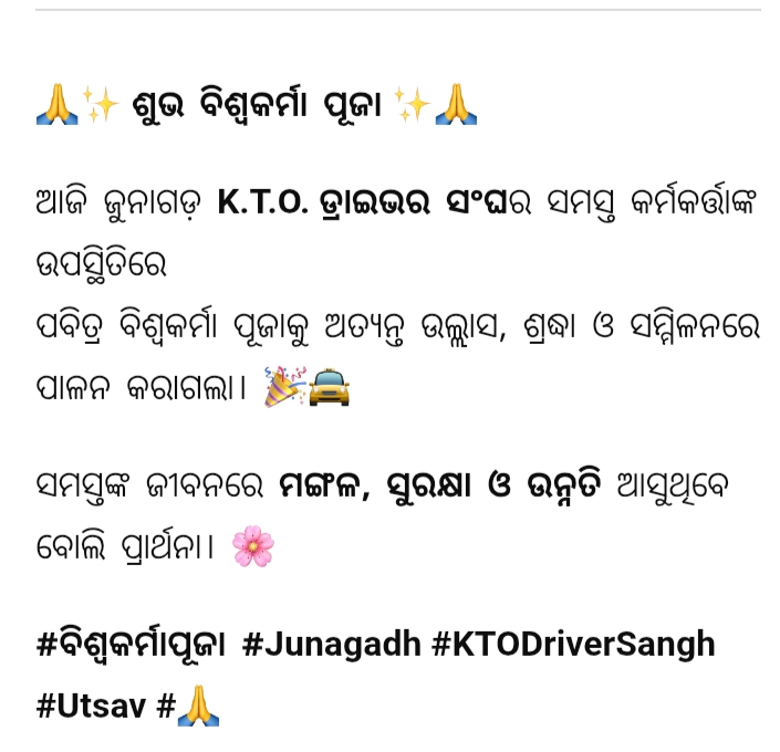 ଜୁନାଗଡ଼ କେ, ଟି, ଓ, ବିଶ୍ଵ କର୍ମା ପୂଜା କାର୍ଯ୍ୟ କର୍ମ ରେ ବିଶ୍ୱର ସାନତୀ ପାଇଁ ଇଶ୍ଵର ପାଖରେ ପାର୍ଥ ନା କରିଥିଲେ