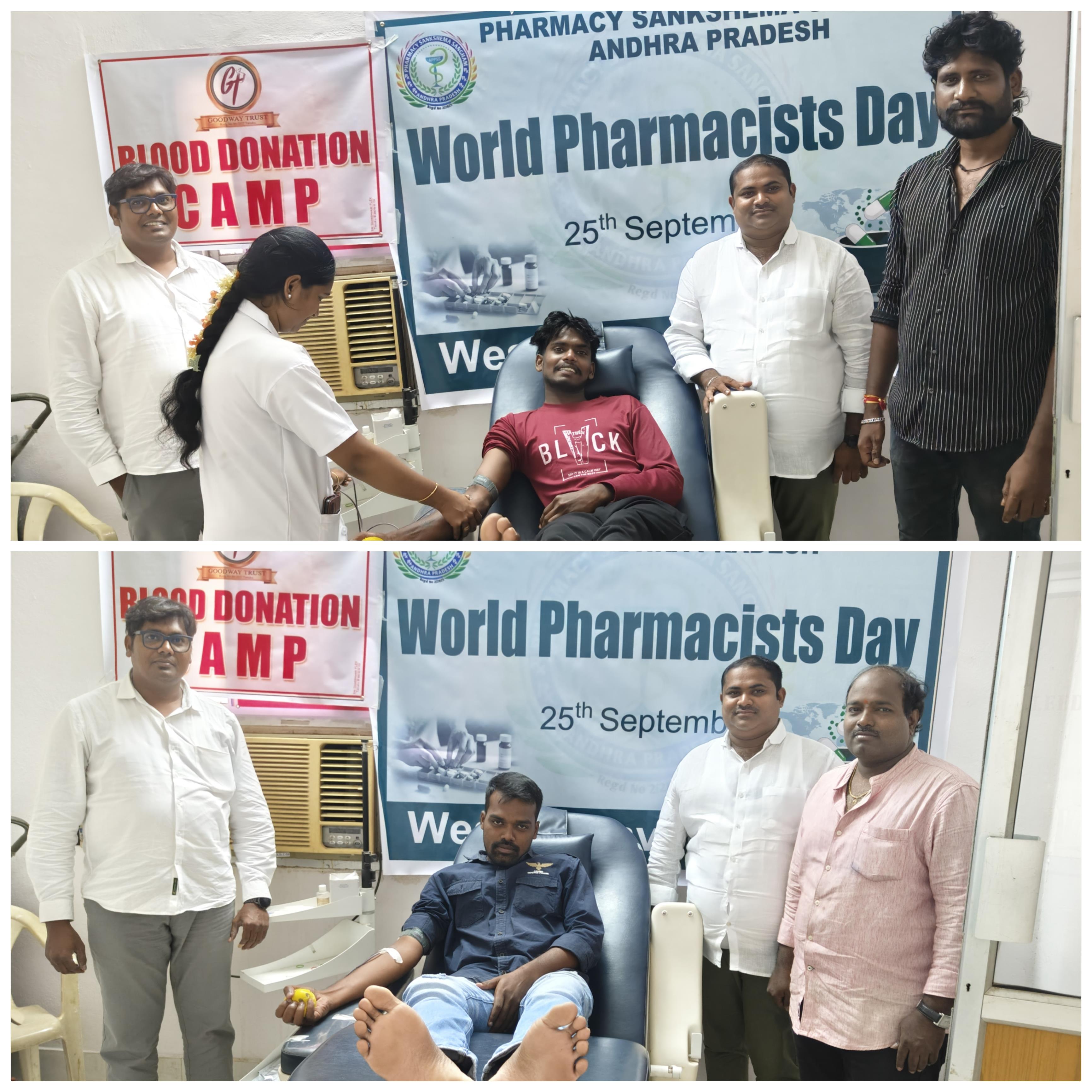 ఈరోజు అనగా సెప్టెంబర్ 25వ తేదీన ప్రపంచ ఫార్మసిస్టు దినోత్సవం సందర్భంగా తణుకు పట్టణంలో గల రెడ్ క్రాస్ బ్లడ్ బ్యాంకులో ఆంధ్రప్రదేశ్ ఫార్మసీ సంక్షేమ సంఘము మరియు గుడ్ వే ట్రస్ట్ సంయుక్తంగా రక్తదాన శిబిరం నిర్వహించారు. ఈ కార్యక్రమాన్ని ఆంధ్రప్రదేశ్ ఫార్మశీ సంక్షేమ సంఘం రాష్ట్ర ఉపాధ్యక్షులు ఇమ్మంది నాగ కృష్ణంరాజు, పశ్చిమ గోదావరి జిల్లా అధ్యక్షులు మరియు గుడ్ వే ట్రస్ట్ ఫౌండర్ & చైర్మన్ బింకం అనీల్ చక్రవర్తి సంయుక్తంగా నిర్వహించారు. తణుకు పరిసరప్రాంత యువకులు వచ్చి రక్తదానం చేసారు.