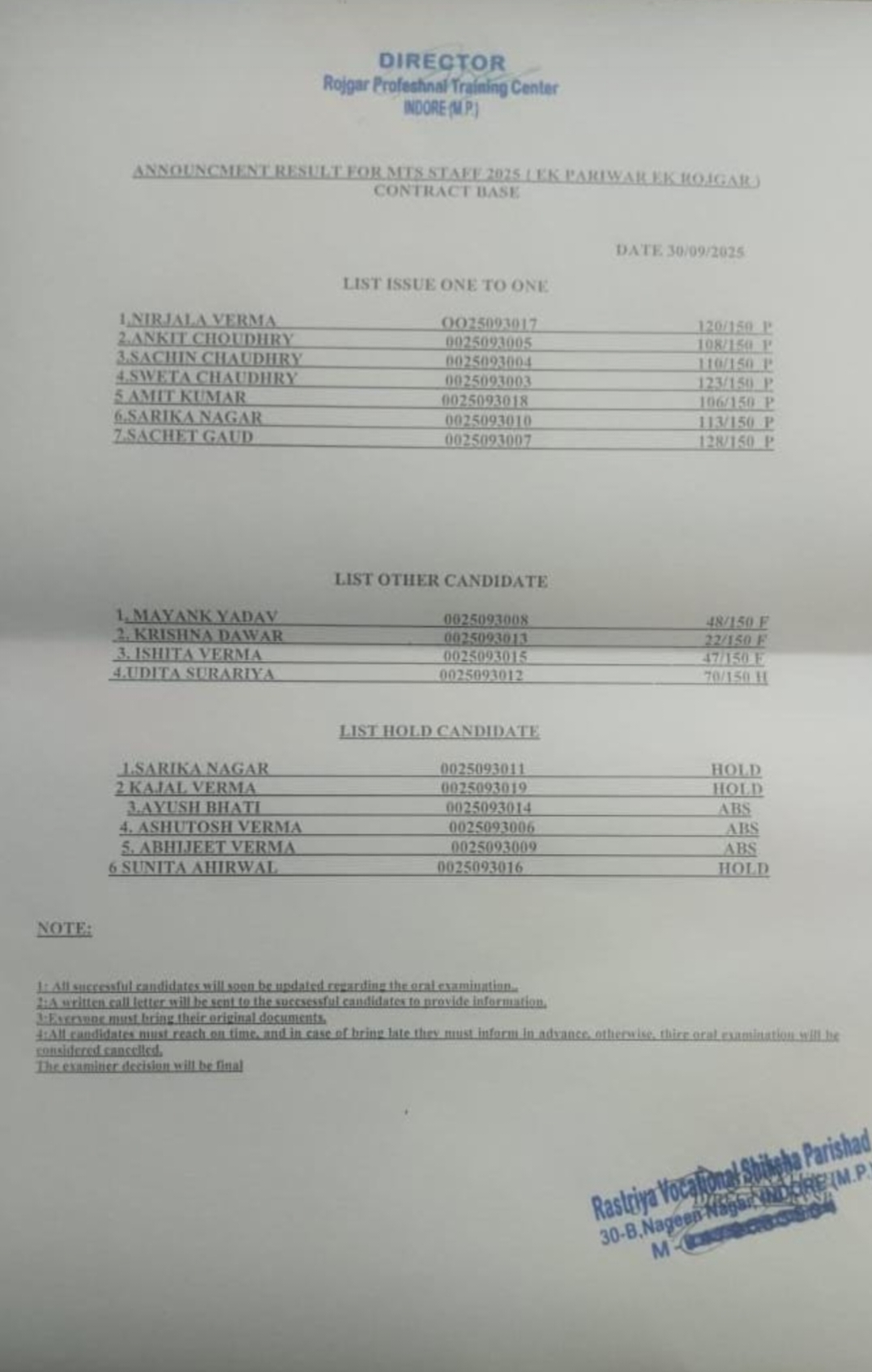 एक परिवार एक नौकरी में सिलेक्शन हुआ इंदौर में अब कॉन्ट्रैक्ट बेस पर नौकरी करेंगे युवा
