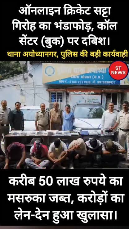 भोपाल में ऑनलाइन क्रिकेट सट्टा गिरोह का भंडाफोड़, अयोध्यानगर पुलिस ने कॉल सेंटर पर दी दबिश, 7 आरोपी गिरफ्तार, 40 मोबाइल, 80 सिम कार्ड, 177 एटीएम कार्ड, 5 लैपटॉप, 2 कार, केस काउंटिंग मशीन और 3.54 लाख रुपए नकदी समेत करीब 50 लाख रुपए का माल जब्त, गिरोह के करोड़ों रुपए के लेनदेन का खुलासा।
