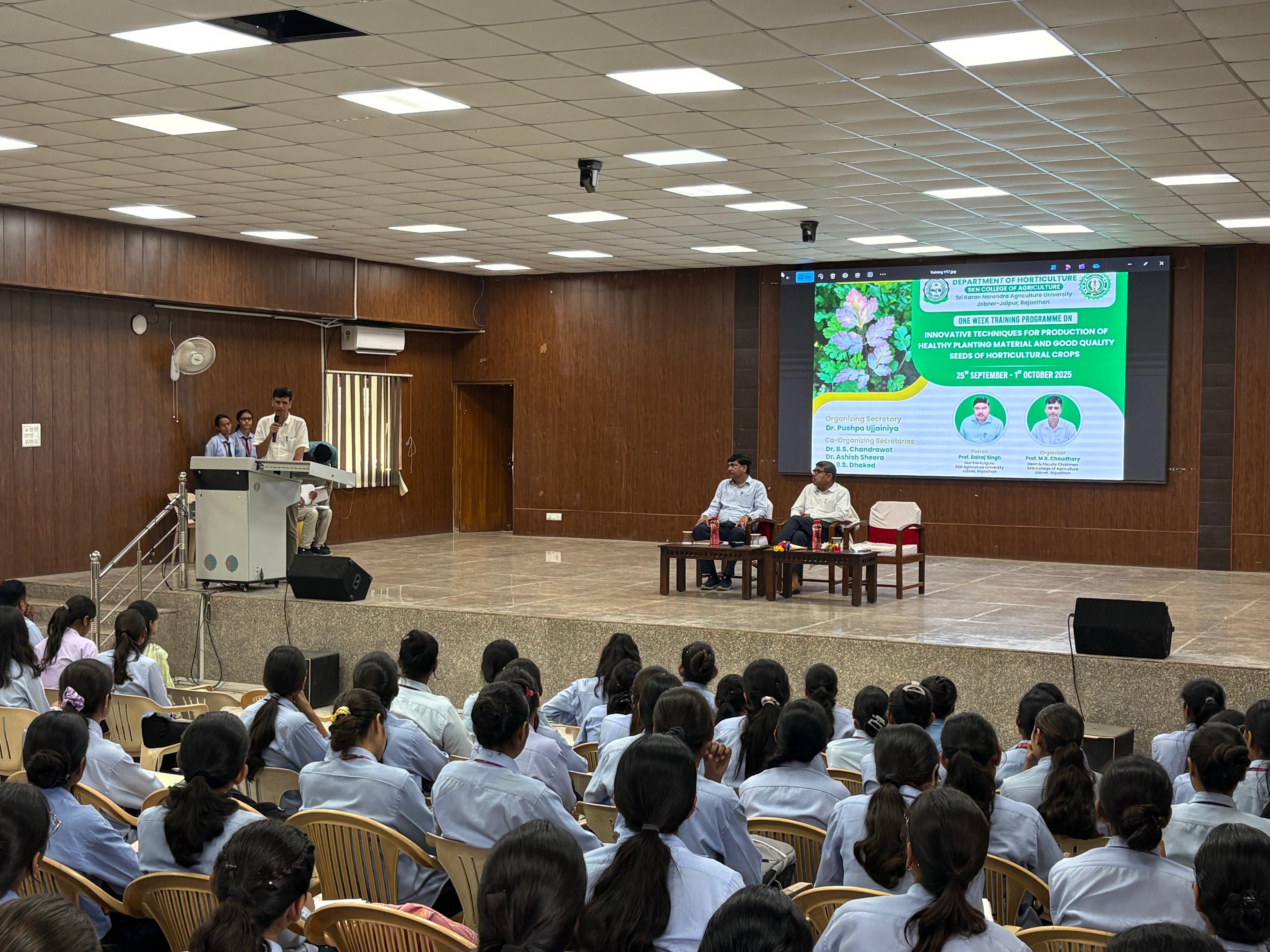 जोबनेर, श्री कर्ण नरेन्द्र कृषि महाविद्यालय, जोबनेर के उद्यान विभाग में राष्ट्रीय कृषि विकास योजना (आरकेवीवाई-30) के अंतर्गत सात दिवसीय सब्जी बीज उत्पादन प्रशिक्षण कार्यक्रम का सफलतापूर्वक समापन हुआ। इस प्रशिक्षण में एम.एससी. एवं बी.एससी. अंतिम वर्ष के कुल 175 विद्यार्थियों ने भाग लिया और उद्यानिकी की नवीन तकनीकों एवं सब्जी बीज उत्पादन की विधियों की महत्वपूर्ण जानकारी प्राप्त की।