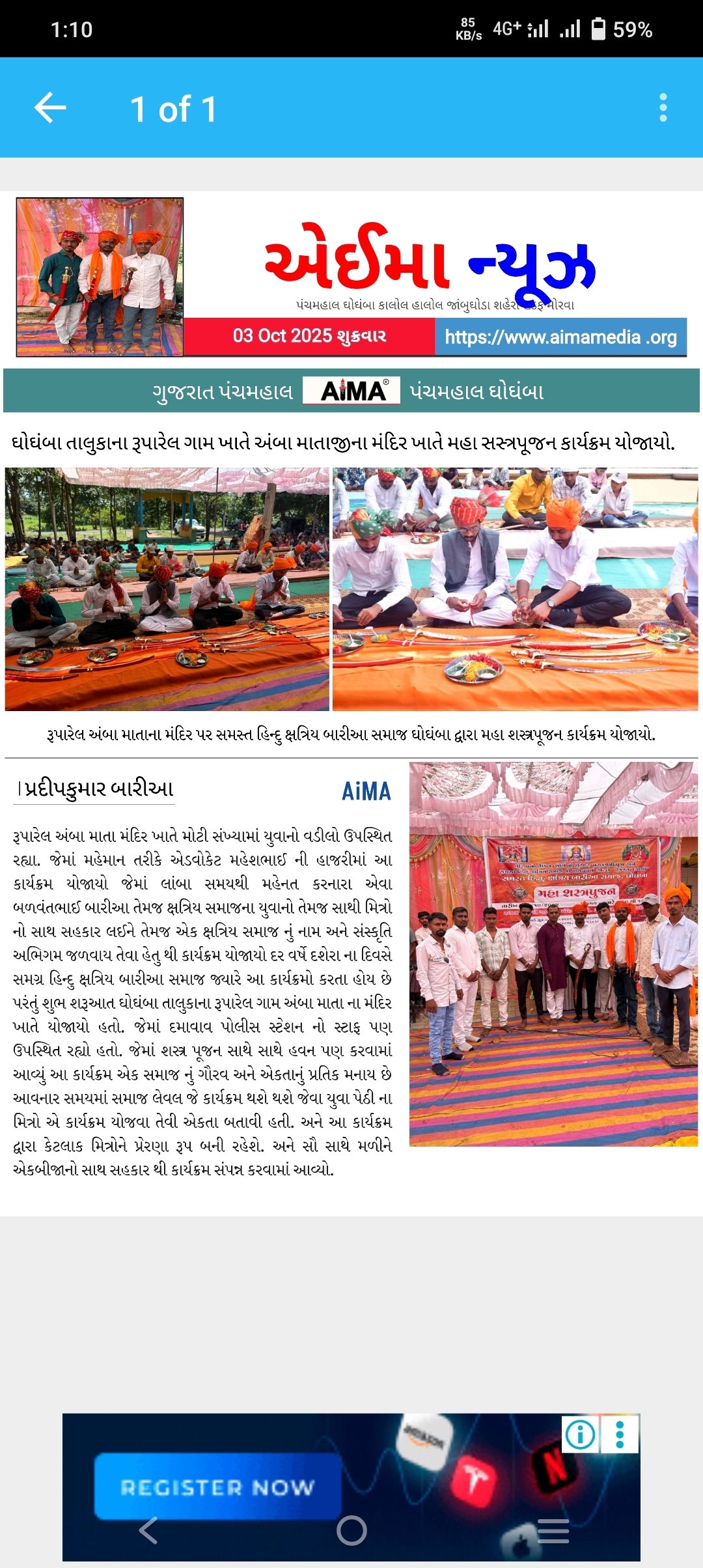 ઘોઘંબા તાલુકામાં રૂપારેલ અંબા માતા ના મંદિર ખાતે શસ્ત્ર પૂજન કરવામાં આવ્યું