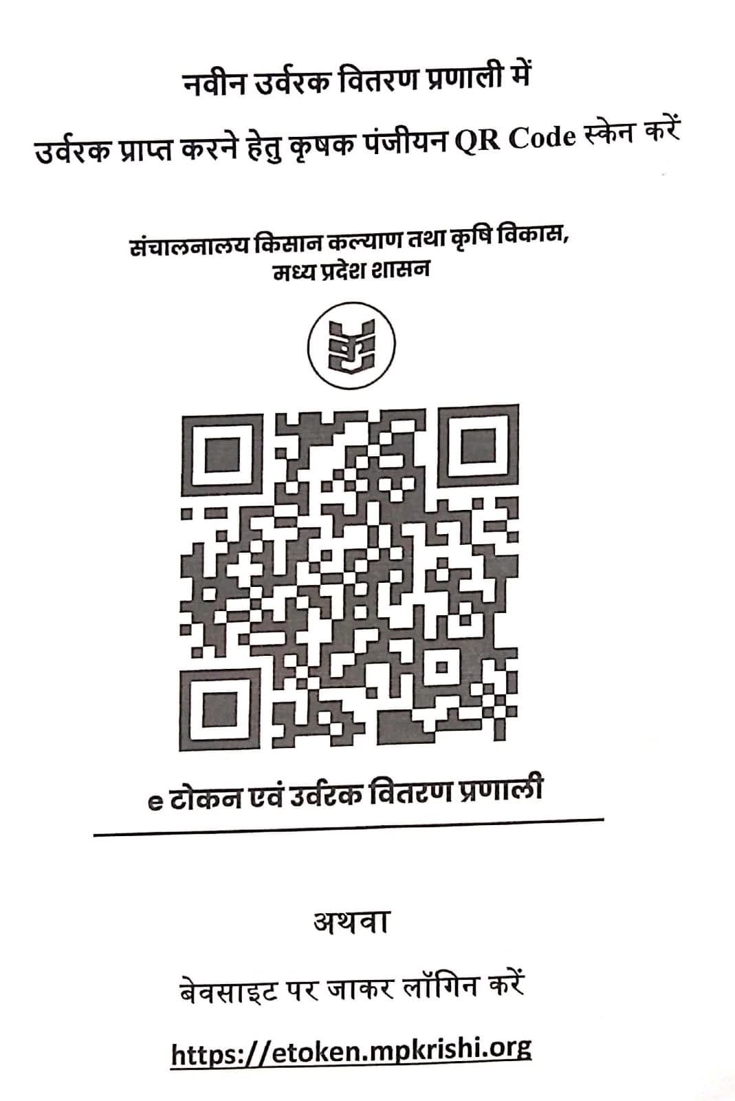 उप संचालक कृषि डॉ निगम ने बताया कि उर्वरक वितरण की नई व्यवस्था के तहत किसानों को किसान कल्याण तथा कृषि विकास विभाग द्वारा तैयार किये गए पोर्टल https://etoken.mpkrishi.org पर ऑनलाइन ई-टोकन (पंजीयन) प्राप्त होगा। इसके अलावा क्यूआरकोड स्कैन कर भी किसान ई-टोकन प्राप्त कर सकेंगे। उन्होंने बताया कि ई-टोकन प्राप्त करने के लिये किसानों को पोर्टल पर आधार नंबर एवं बोई गई फसल की जानकारी देनी होगी तथा उर्वरक प्राप्त करने डबल लॉक केंद्र, सहकारी समिति या निजी विक्रेता का चयन करना होगा। पोर्टल पर दर्ज की गई जानकारी के आधार पर किसान को ई-टोकन प्राप्त होगा जिसके माध्यम से चयनित संस्था या निजी विक्रेता से उर्वरक प्राप्त किया जा सकेगा।