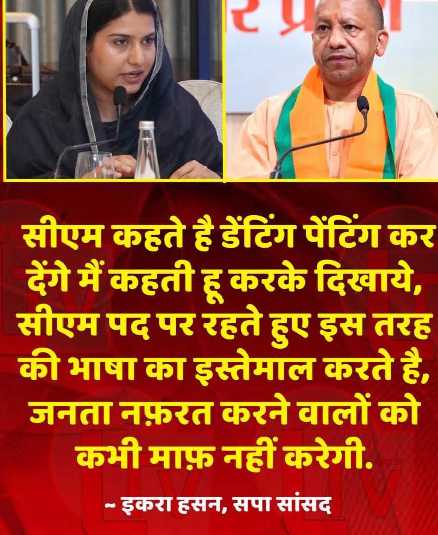 समाजवादी पार्टी की सांसद इकरा हसन ने मुख्यमंत्री योगी आदित्यनाथ की टिप्पणी पर तीखी प्रतिक्रिया दी है। इकरा हसन ने कहा, “सीएम कहते हैं डेंटिंग-पेंटिंग कर देंगे। मैं कहती हूं, करके दिखाइए। मुख्यमंत्री रहते हुए अगर कोई ऐसी भाषा बोलता है तो यह जनता का अपमान है। नफ़रत फैलाने वालों को जनता कभी माफ़ नहीं करेगी।”