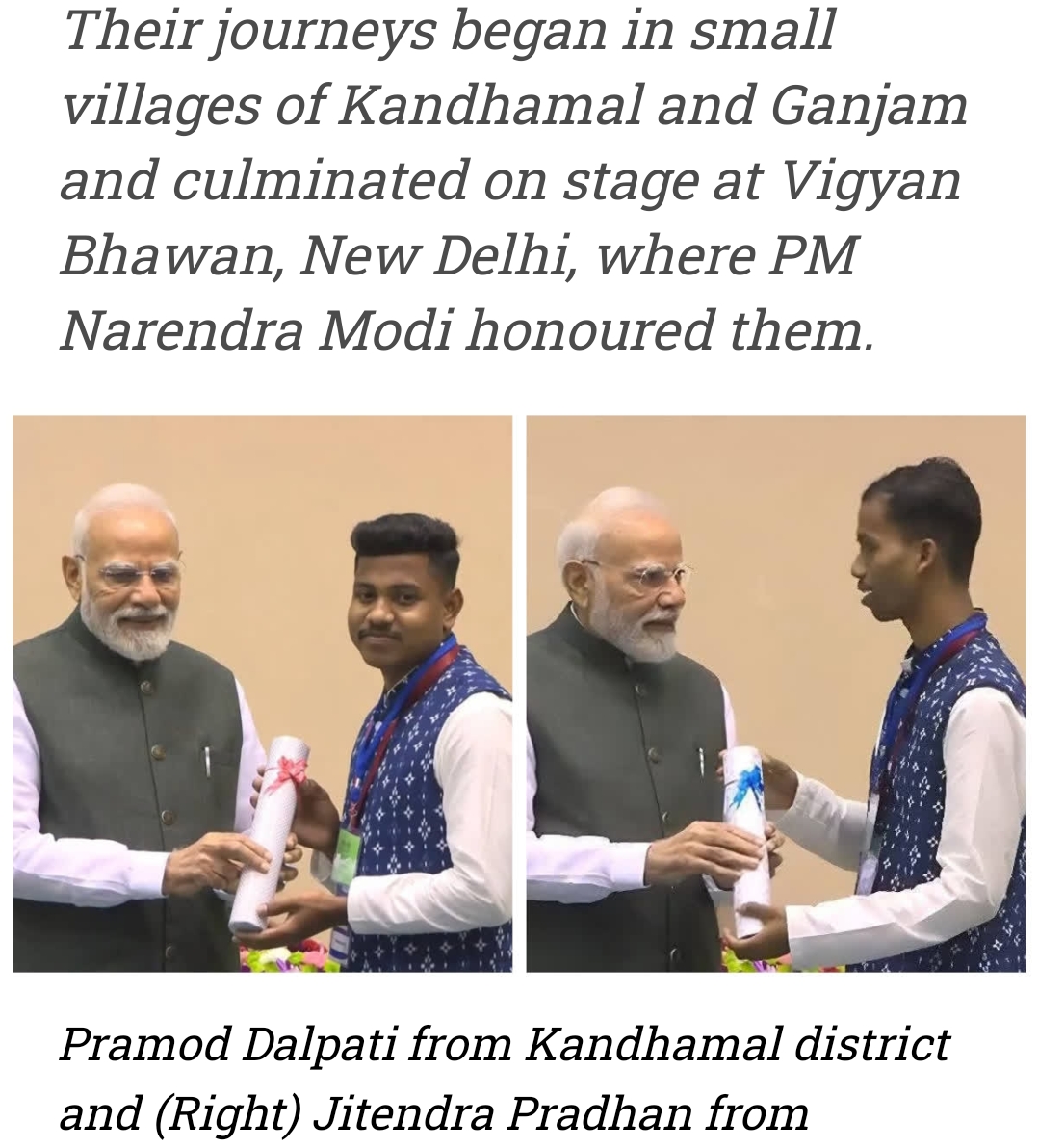 Berhampur, Odisha – October 6, 2025 – Two young talents from Odisha, Pramod Dalpati from Kandhamal and Jeetendra Pradhan from Ganjam, were felicitated by Prime Minister Narendra Modi at the 4th Kaushal Deekshant Samaroh on October 4, 2025, at Vigyan Bhawan, New Delhi. The duo topped the All India Trade Test (AITT) in August 2025, earning national recognition among 46 outstanding ITI and NSTI trainees.