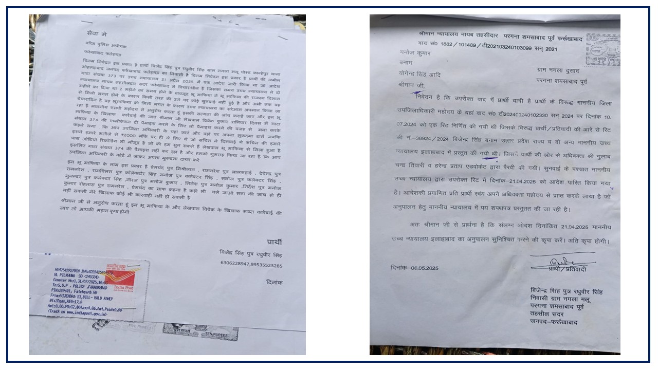 फर्रुखाबाद के तहसील सदर राजस्व विभाग दे रहा है भू माफियाओं को शरण नहीं हो रही किसी भी प्रकार की कार्रवाई! मामला फर्रुखाबाद तहसील सदर का है जहां पर लेखपाल विवेक कुमार पर लगे गंभीर आरोप पैमाइश करने को तैयार नहीं है! ग्राम मालू तहसील सदर के निवासी विजेंद्र सिंह पुत्र रघुवीर का कहना है कि हमारी जमीन गाटा संख्या 374 मौज दुसाध में आती है जो कि मेरे पिताजी रघुवीर पुत्र इतवारी लाल के नाम पर दर्ज है! विजेंद्र सिंह ने बताया कि उनकी जमीन पर अवैध तरीके से कब्जा क्या हुआ है, कब्जा करने वाले गुंडागर्दी करते हुए डराते धमकाते हैं जिसकी शिकायत कई बार की लेकिन किसी भी प्रकार से संतुष्टि पूर्वक जवाब नहीं मिला! विजेंद्र सिंह पुत्र रघुवीर का कहना है कि उनकी जमीन पर कब्जा करने वालों के नाम मनोज कुमार पुत्र कलेक्टर सिंह नरेश पुत्र लाल सहाय देवेंद्र पुत्र रामनरेश रोहतास पुत्र रामनरेश रामविलास पुत्र कलेक्टर सिंह सनोज कुमार कलेक्टर सिंह मुनेंद्र पुत्र कलेक्टर सिंह एवं अंशुल पुत्र रामविलास इनके अलावा मनोज के तीन पुत्र भी शामिल है! जब इसकी सूचना हमने राजस्वबात विभाग के लेखपाल विवेक कुमार को दी उन्होंने टालमटोल कर गुमराह कर दिया और उनकी शिकायत पर किसी भी प्रकार की अभी तक पैमाइश नहीं की जा रही है! विजेंद्र सिंह ने लेखपाल विवेक कुमार पर गंभीर आरोप लगाते हुए बताया कि उन्होंने लेखपाल ने अभी तक हमारा किसी भी प्रकार से संतुष्टि पूर्वक न्याय नहीं हुआ है!