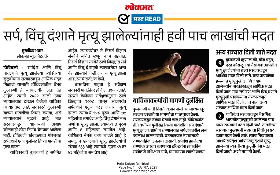 सर्पदंश आणि विंचू चावल्याने मृत्यू झालेल्या व्यक्तींच्या कुटुंबियांना सरकारकडून आर्थिक मदत मिळावी, यासाठी डोंबिवलीतील वैभव कुलकर्णी यांनी न्यायालयीन लढा दिला आहे. त्यांनी २०२२ साली उच्च न्यायालयात दाखल केलेली याचिका न्यायप्रविष्ट आहे. सरकारने कुलकर्णी यांची मागणी विचारात घ्यावी, अशी न्यायालयाने सूचनाही दिली आहे.