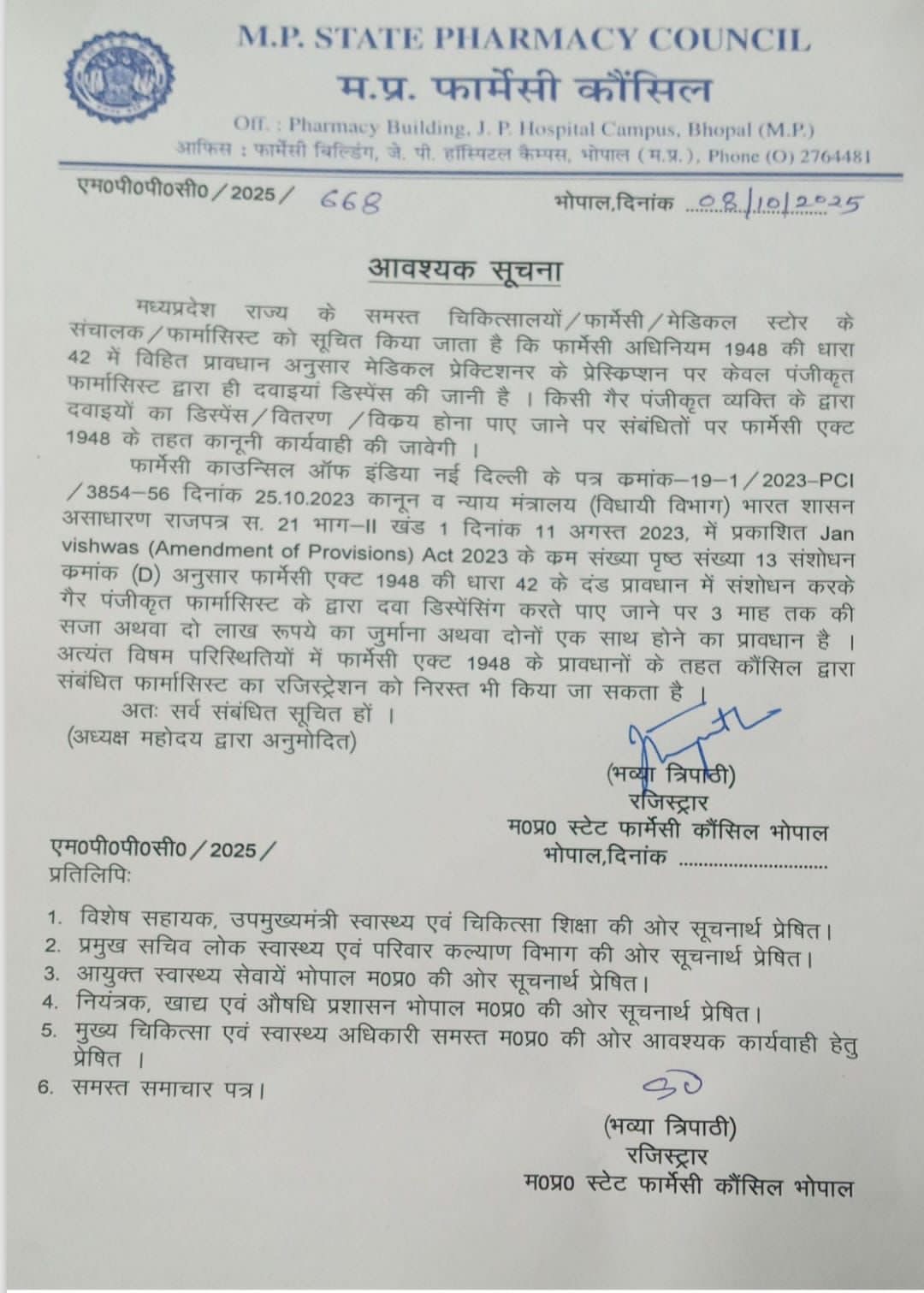 काउंसिल द्वारा जारी इस महत्वपूर्ण अधिसूचना में स्पष्ट किया गया है कि यह आदेश फार्मेसी अधिनियम 1948 की धारा 42 एवं Jan Vishwas (Amendment of Provisions) Act, 2023 के तहत जारी किया गया है। यदि बिना पंजीकृत फार्मासिस्ट के दवाइयों की बिक्री या वितरण किया जाता है, तो संबंधित व्यक्ति या संस्थान के विरुद्ध कानूनी कार्रवाई की जाएगी तथा आवश्यकतानुसार फार्मासिस्ट का पंजीकरण निलंबित या निरस्त किया जा सकता है।