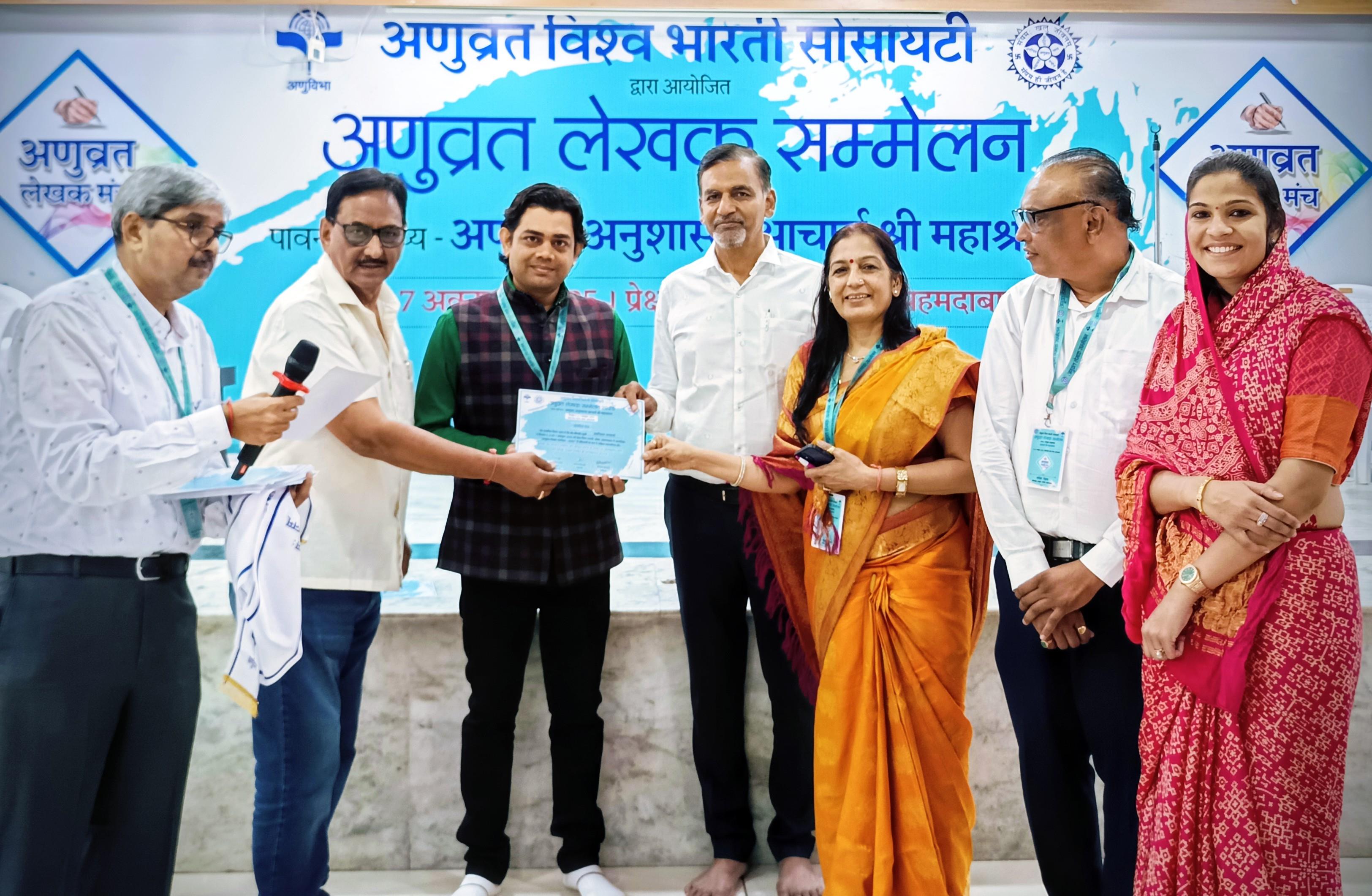 અણુવ્રત વિશ્વભારતી સોસાયટી દ્વારા યોજાયેલા 2025 લેખક સંમેલનમાં અમદાવાદના લેખક અને સંપાદક સ્વપ્નીલ આચાર્યનું સાલ અને પ્રમાણપત્રથી સન્માન કરવામાં આવ્યું જેનું આયોજન