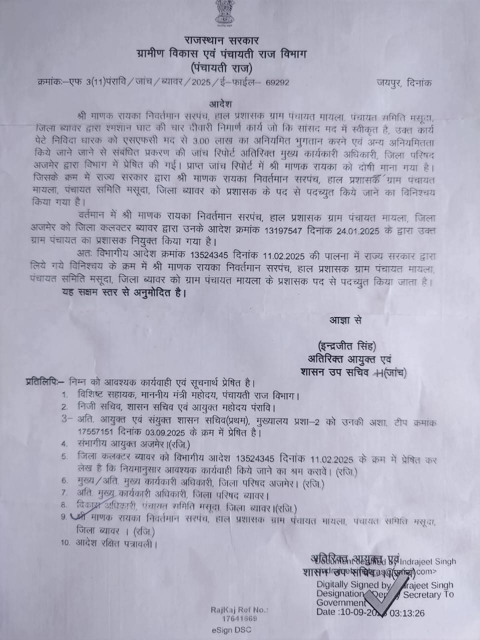 विभागीय आदेश क्रमांक 13524345 दिनांक 11.02.2025 की पालना में राज्य सरकार द्वारा लिये गये विनिश्चय के क्रम में माणक रायका निवर्तमान सरपंच, हाल प्रशासक ग्राम पंचायत मायला, पंचायत समिति मसूदा, जिला ब्यावर की जांच में ग्राम पंचायत मायला के प्रशासक पद से पदच्युत किया गया।