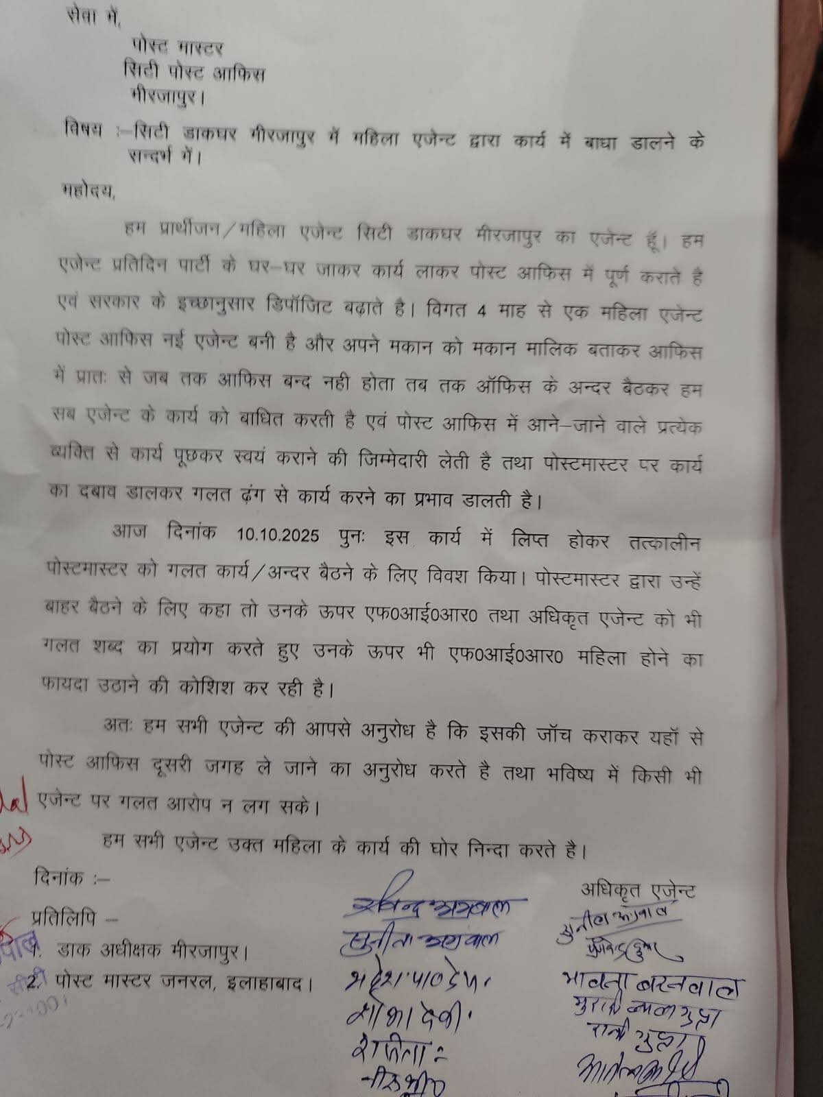 मीरजापुर सिटी, उपडाकपाल पोस्ट ऑफिस पर अनुचित प्रभाव डालकर एक नई महिला एजेंट, जो पिछले लगभग चार माह पूर्व से सरकारी कार्यों को बाधित कर रही है, प्रायः अन्य अभिकर्ताओं को अपमानित करती रहती है। सूत्रों के अनुसार ज्ञात हुआ है कि यह उसी मकान की मालकिन है, जहाँ पर यह पोस्ट ऑफिस स्थित है। यह एजेंट काउंटर के अंदर सुबह से शाम तक ऑफिस में बैठी रहती है, जबकि किसी भी अभिकर्ता को ऐसा कोई आदेश या निर्देश नहीं है। आये दिन अन्य एजेंट्स के खाताधारकों को बहकाने तथा असफल होने पर महिला होने के नाते अभद्र शब्दों का प्रयोग करती है, पुरुष अभिकर्ता संकोच में कुछ नहीं कर पाते हैं। अतः डाक अधीक्षक से अनुरोध है कि उसके अवांछित गतिविधियों की निगरानी रखें।