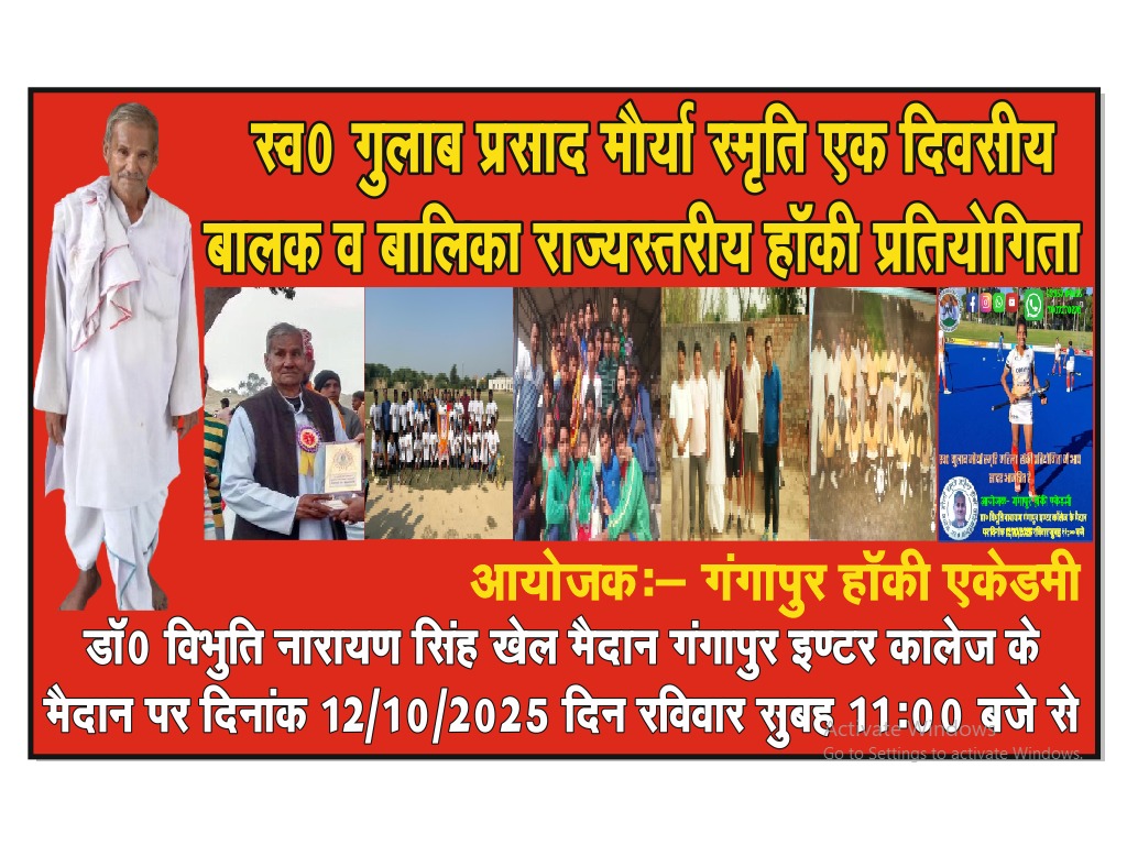स्वर्गीय गुलाब प्रसाद मौर्य बालक बालिका एक दिवसीय हाकी प्रतियोगिता का आयोजन डा विभुतियों नारायण सिंह खेल मैदान गंगापुर इन्टर कालेज पर हुआ जिसमे गंगापुर एकेडमी की बालिका टीम ने विजय एकेडमी को हराकर विजेता बनी।