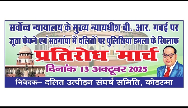 सर्वोच्च न्यायालय के मुख्य न्यायाधीश बी आर गवई पर जूता फेंकने एवं सतगावा में दलितों पर पुलिसिया हमले को लेकर प्रतिरोध मार्च ,समय 01 बजे दिन दिनांक:- 13/10/2025 स्थान:- सुभाष चौक बाईपास से महाराणा प्रताप चौक झु0 तिलैया तक