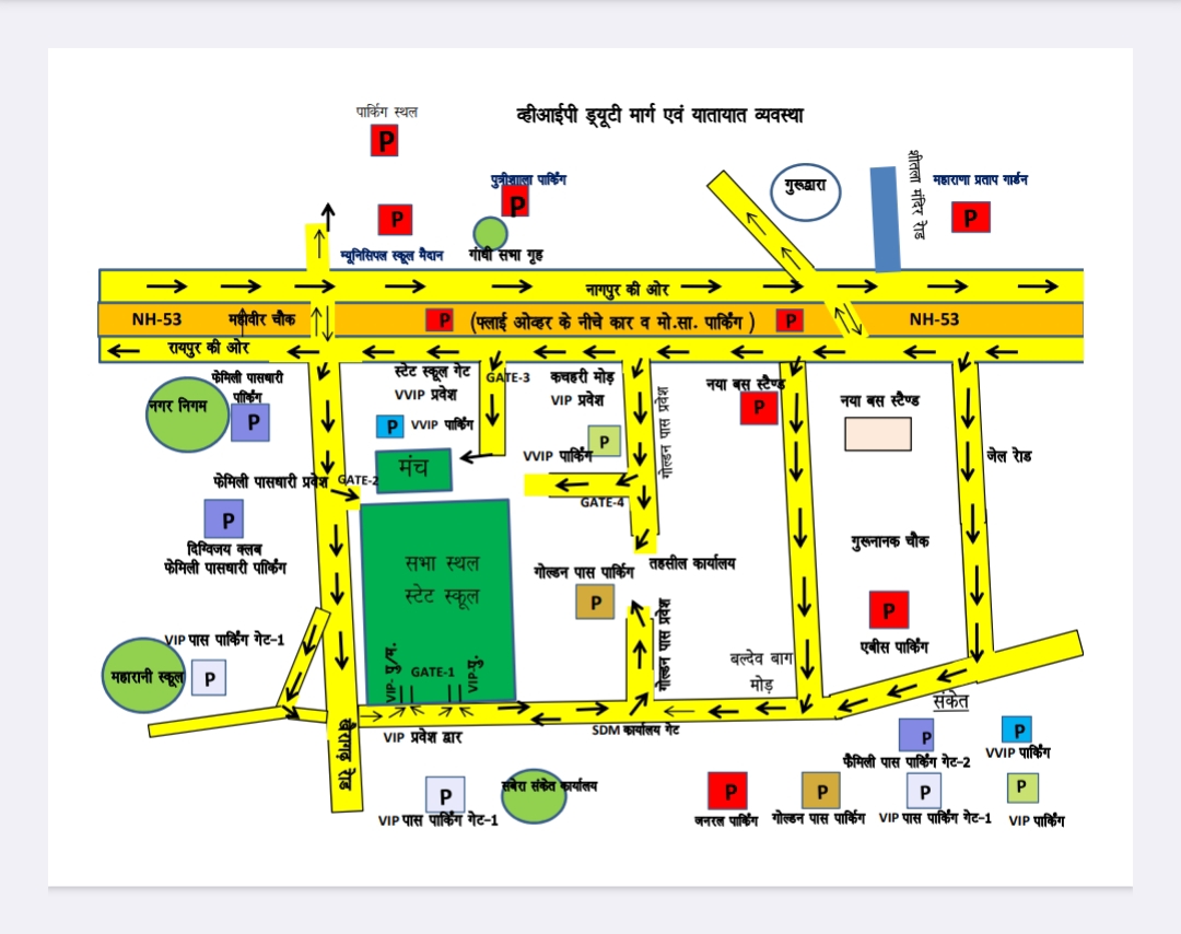 ऽ गेट नंबर 03 लॉ कॉलेज के बाजू स्टेट स्कूल प्रवेश द्वार से केवल व्हीव्हीआईपी एवं मेम्बर फैमिली पास वाहनां का प्रवेश होगा। इनका पार्किंग स्टेट स्कूल मंच के पीछे रहेगा।