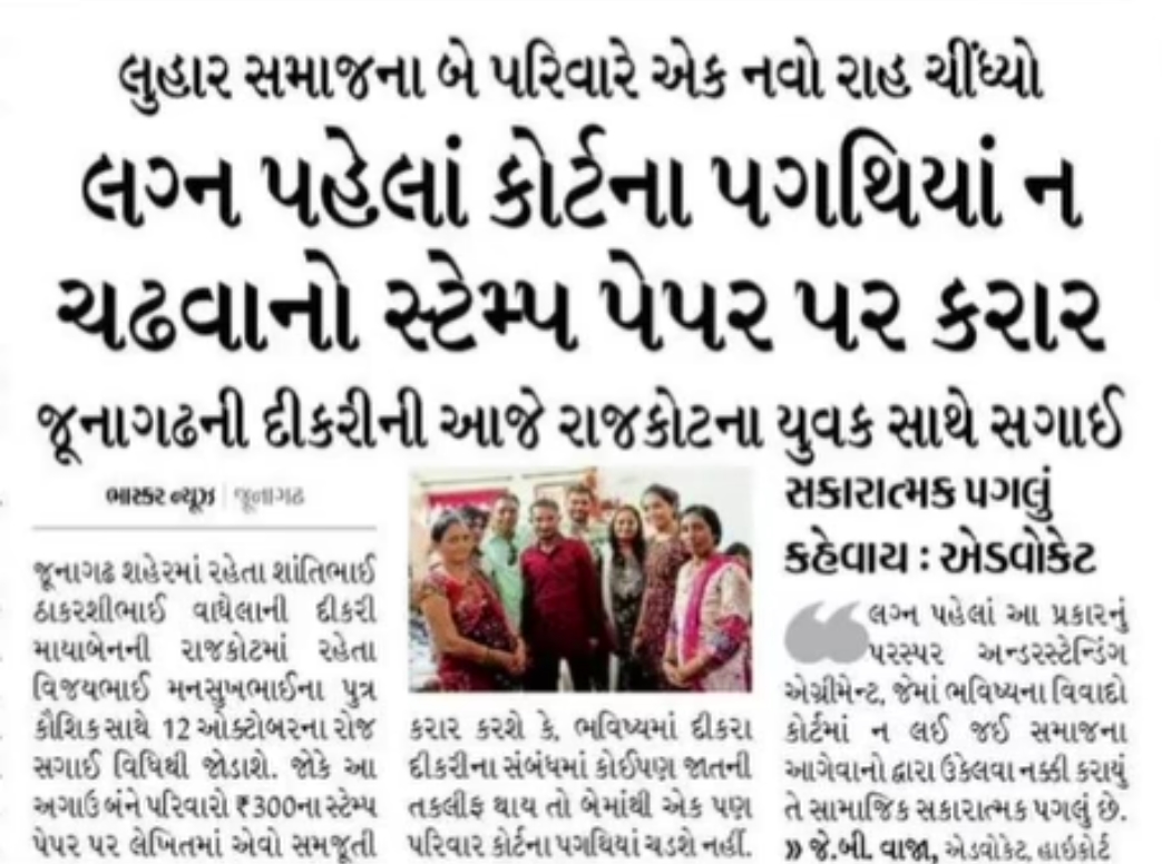 लोहार समुदाय के दो परिवारों ने एक नया रास्ता तय कियास्टाम्प पेपर पर शादी से पहले कोर्ट न जाने का समझौताजूनागढ़ की लड़की की आज राजकोट के लड़के से सगाई