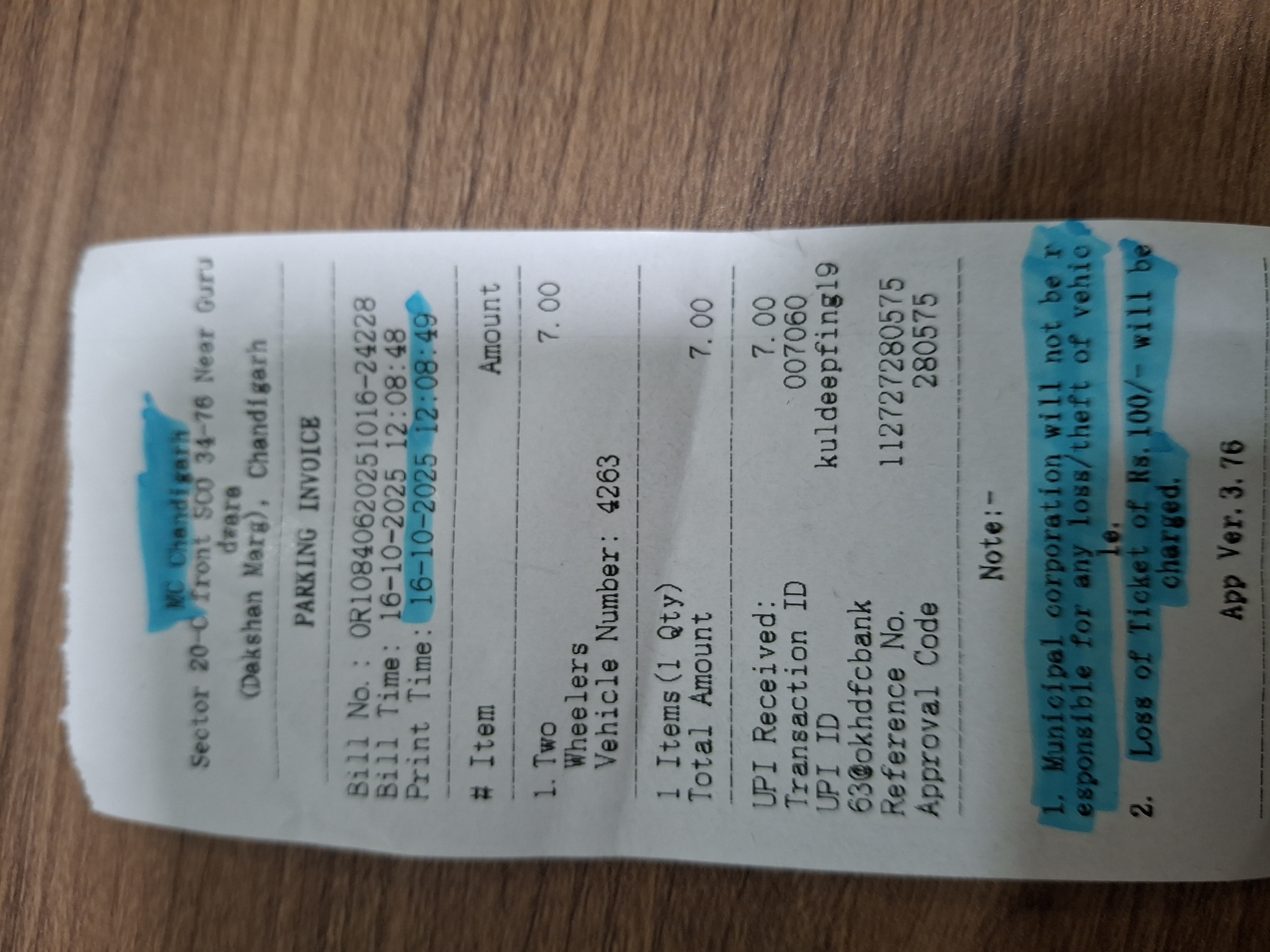 Aaj Maine MC Chandigarh Sector 20 me apni scooty parking ki or payment Kar parchi li to nazar Pari parchi ke note me likhe poin 1 or 2 per to ascharya huwa agar aap ki vehicle loss ya chori ho Jaye to parking wale ki koi jimmedari nahi per agar aapki parchi missing ho Jaye to Rs.100 charge karnge.