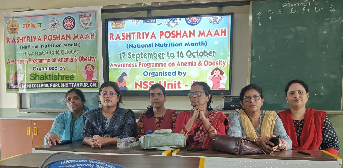 ଗଞ୍ଜାମ ଜିଲ୍ଲା -ପୁରୁଷୋତ୍ତମପୁର: ତା-୧୬/୧୦/୨୫ରିଖ ସ୍ଥାନୀୟ ତାରାତାରିଣୀ ମହାବିଦ୍ୟାଳୟରେ ଜାତୀୟ ସେବା ଯୋଜନା ଅଧିକାରୀ ସୁଶ୍ରୀ ସ୍ୱାଗତିକା ଦାଶ ସହ ଆଇସିସି ଓ ଶକ୍ତିଶ୍ରୀ ସଂଯୋଜୀକା ଶ୍ରୀମତୀ ନମ୍ରତା ମିଶ୍ରଙ୍କ ମିଳିତ ଆନୁକୁଲ୍ୟରେ ଜାତୀୟ ପୋଷଣ ମାସ - ପାଳିତ ହୋଇଯାଇଛି। ଏଥିରେ ମହାବିଦ୍ୟାଳୟର ଅଧ୍ୟକ୍ଷା ଶ୍ରୀମତୀ ସନ୍ଧ୍ୟାରାଣି ପାତ୍ରଙ୍କ ଅଧ୍ୟକ୍ଷତାରେ ଏକ କର୍ମଶାଳା ଓ ସଚେତନତା ଶିବିର ଅନୁଷ୍ଠିତ ହୋଇଥିଲା। ଏଥିରେ ଅଧ୍ୟକ୍ଷା ଶ୍ରୀମତୀ ପତ୍ର ନିଜର ଅଭିଭାଷଣରେ ,ପୋଷଣ,କୁପୋଷଣ,ମେଦବହୁଲତା ଏବଂ ରକ୍ତ ହୀନତା ସବନ୍ଧରେ ବକ୍ତବ୍ୟ ରଖିଥିବା ବେଳେ ପ୍ରାଣୀ ବିଜ୍ଞାନ ଅଧ୍ୟାପିକା ତଥା ଶକ୍ତିଶ୍ରୀ ସଂଜୋଜିକା ଶ୍ରୀମତୀ ନମ୍ରତା ମିଶ୍ର ଏଲ୍ଇଡି ମାଧ୍ୟମରେ ମେଦବହୁଲତା ଓ ରକ୍ତହୀନତା ଉପରେ ବିସ୍ତୃତ ଭାବେ ଆଲୋଚନା କରିଥିଲେ। ଏଥିରେ ଶକ୍ତିଶ୍ରୀ ସହ ସଞ୍ଜୋଜିକା ଶ୍ରୀମତୀ ସୁଜାତା କୁମାରୀ ଦାଶ ଉପସ୍ଥିତ ରହିଥିବାବେଳେ ଶ୍ରୀମତୀ ରୀତାଞ୍ଜଳି ସାହୁ ସହଯୋଗ କରିଥିବା ବେଳେ ଶତାଧିକ ଛାତ୍ରଛାତ୍ରୀ ଉପସ୍ଥିତ ଥିଲେ।ପରିଶେଷରେ ଅର୍ଥନୀତି ବିଭାଗର ଅଧ୍ୟାପିକା ସୁଶ୍ରୀ ମୀନାକ୍ଷୀ ଦାଶ ଧନ୍ୟବାଦ୍ ପ୍ରଦାନ କରିଥିଲେ।