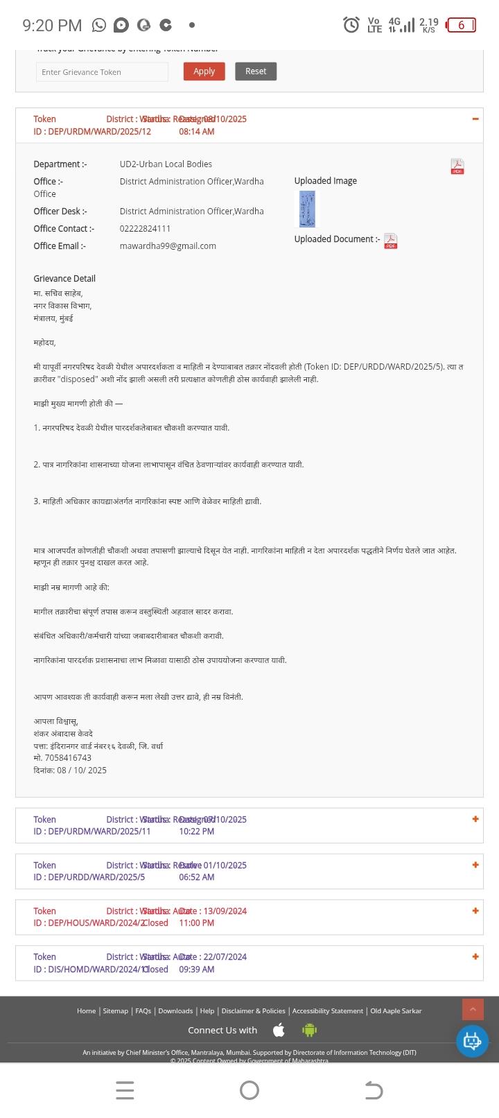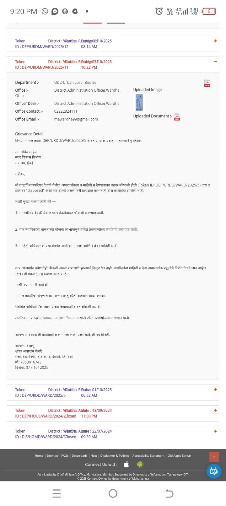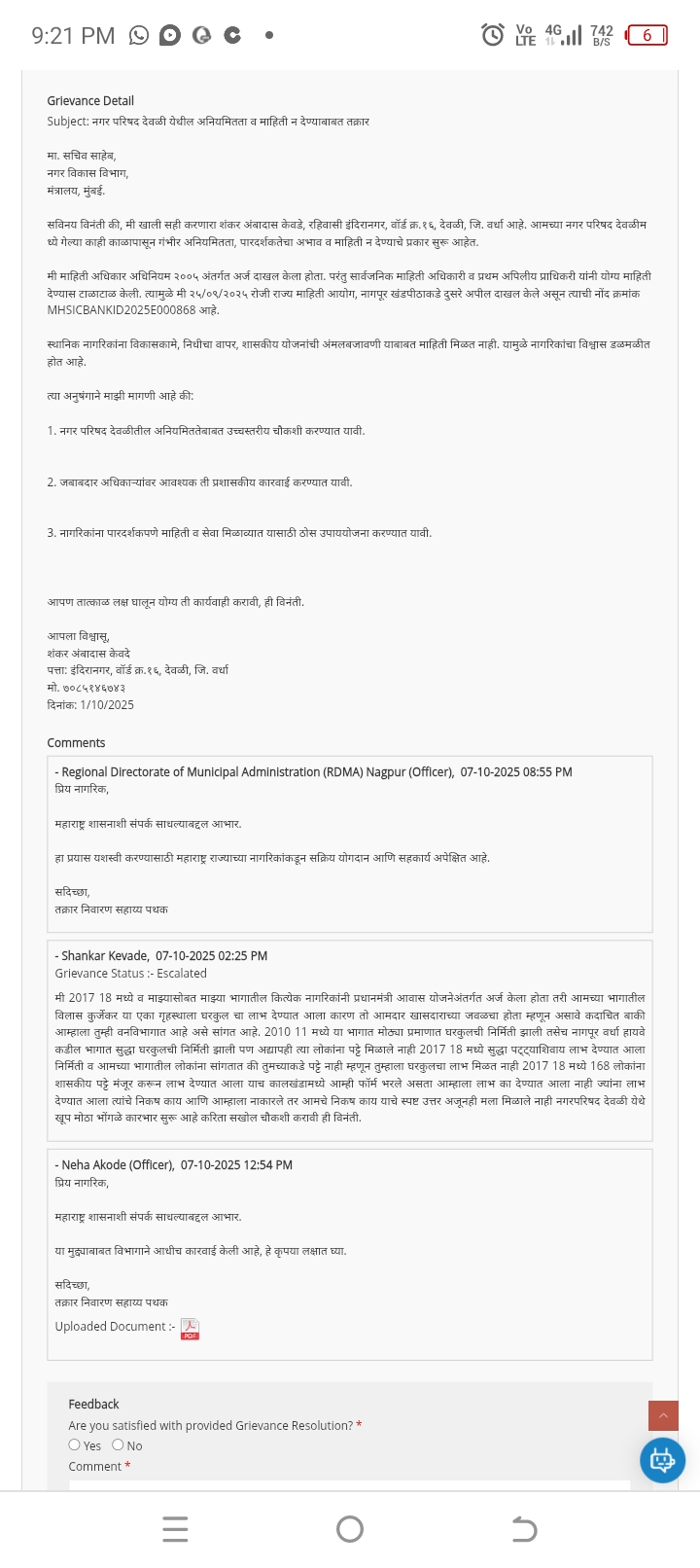 देवळी (जि. वर्धा) —देवळी नगरपरिषद येथील पारदर्शकतेच्या अभावामुळे आणि नागरिकांच्या तक्रारींकडे वारंवार दुर्लक्ष होत असल्याने नागरिकांचा संयम संपत चालला आहे. प्रधानमंत्री आवास योजना (BLC) अंतर्गत पात्र असूनही अनेक अर्जदारांना लाभ न मिळाल्याची बाब समोर आली आहे.शंकर अंबादास केवदे (इंदिरानगर, देवळी) यांनी यासंदर्भात नगर विकास विभागाकडे आणि नागपूर प्रादेशिक संचालकांकडे तक्रारी दाखल केल्या.तक्रारींचे क्रमांक —🔸 Token ID: DEP/URDD/WARD/2025/5🔸 DEP/URDM/WARD/2025/11🔸 DEP/URDM/WARD/2025/12मात्र, सर्व तक्रारींना "Disposed" किंवा "Escalated" अशी नोंद करून कोणतीही ठोस कार्यवाही करण्यात आलेली नाही.केवदे यांनी स्पष्ट सांगितले की —> “२०१७-१८ मध्ये आम्ही अतिक्रमणधारक म्हणून अर्ज केला होता. अनेकांना घर मिळाले पण आमच्यासारखे काही अर्जदार आजही प्रतीक्षेत आहेत. आम्ही न्यायासाठी वारंवार तक्रारी दिल्या, पण प्रशासनाकडून केवळ कागदी उत्तरं मिळत आहेत.”त्यांनी आणखीही प्रश्न उपस्थित केला की, नागरिकांना माहिती अधिकाराखाली मागितलेली माहिती वेळेत दिली जात नाही, त्यामुळे अपारदर्शकता वाढते आहे.नागरिकांचा ठाम आरोप आहे की नगरपरिषद स्तरावर अनेक निर्णय गुप्तपणे घेतले जातात आणि पात्र लाभार्थ्यांना योजनांपासून वंचित ठेवले जाते.या पार्श्वभूमीवर प्रशासनाच्या उत्तरदायित्वावर मोठा प्रश्नचिन्ह उभा राहिला आहे.जनतेचा विश्वास परत मिळवायचा असेल, तर शासनाने तक्रार यंत्रणा फक्त वेबसाइटपुरती न ठेवता ती प्रत्यक्ष कृतीक्षम बनवावी, अशी नागरिकांची मागणी आहे.🖋️ – शंकर केवदेप्रतिनिधी, ऑल इंडिया मीडिया असोसिएशन देवळी, जि. वर्धा16 ऑक्टोबर 2025