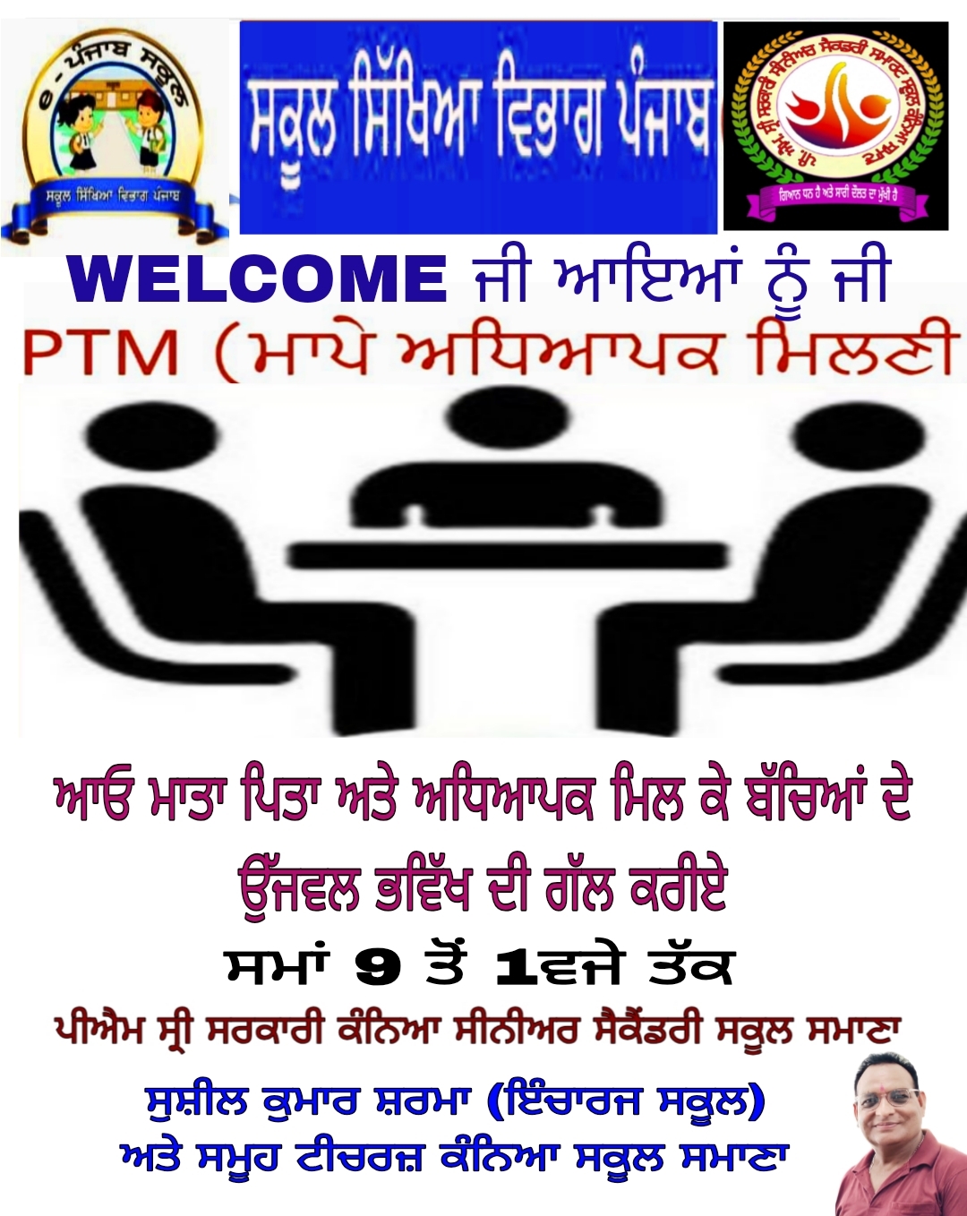ਪੰਜਾਬ ਸਰਕਾਰ ਸਿੱਖਿਆ ਵਿਭਾਗ ਦੀ ਹਦਾਇਤਾਂ ਅਨੁਸਾਰ 17/10/2025 ਦਿਨ ਸ਼ੁਕਰਵਾਰ ਨੂੰ ਪੀ ਐਮ ਸ੍ਰੀ ਸਰਕਾਰੀ ਕੰਨਿਆ ਸੀਨੀਅਰ ਸੈਕੈਂਡਰੀ ਸਕੂਲ ਸਮਾਣਾ ਵਿਖੇ ਸਵੇਰੇ 9 ਵਜੇ ਤੋਂ 1 ਵਜੇ ਤੱਕ ਮੈਗਾ ਮਾਪੇ ਅਧਿਆਪਕ ਮਿਲਣੀ ਕਰਵਾਈ ਜਾਣੀ ਹੈ ਕੰਨਿਆ ਸਕੂਲ ਵਿੱਚ ਪੜਦੀਆਂ ਵਿਦਿਆਰਥਨਾਂ ਦੇ ਮਾਤਾ ਪਿਤਾ ਨੂੰ ਬੇਨਤੀ ਹੈ ਕਿ ਆਪਣੇ ਬੱਚਿਆਂ ਦੇ ਉਜਵਲ ਭਵਿੱਖ ਲਈ ਬੱਚਿਆਂ ਦੇ ਅਧਿਆਪਕਾਂ ਨੂੰ ਜਰੂਰ ਮਿਲਣ ਤਾਂ ਕਿ ਵਿਦਿਆਰਥੀਆਂ ਦੇ ਪੜਾਈ ਸਬੰਧੀ ਗੱਲਬਾਤ ਕੀਤੀ ਜਾ ਸਕੇ ਬੇਨਤੀ ਕਰਤਾ ਸਕੂਲ ਇੰਚਾਰਜ ਸੁਸ਼ੀਲ ਕੁਮਾਰ ਸ਼ਰਮਾ ਅਤੇ ਸਮੂਹ ਟੀਚਰਜ ਪੀਐਮ ਸ਼੍ਰੀ ਕੰਨਿਆ ਸਕੂਲ ਸਮਾਣਾ