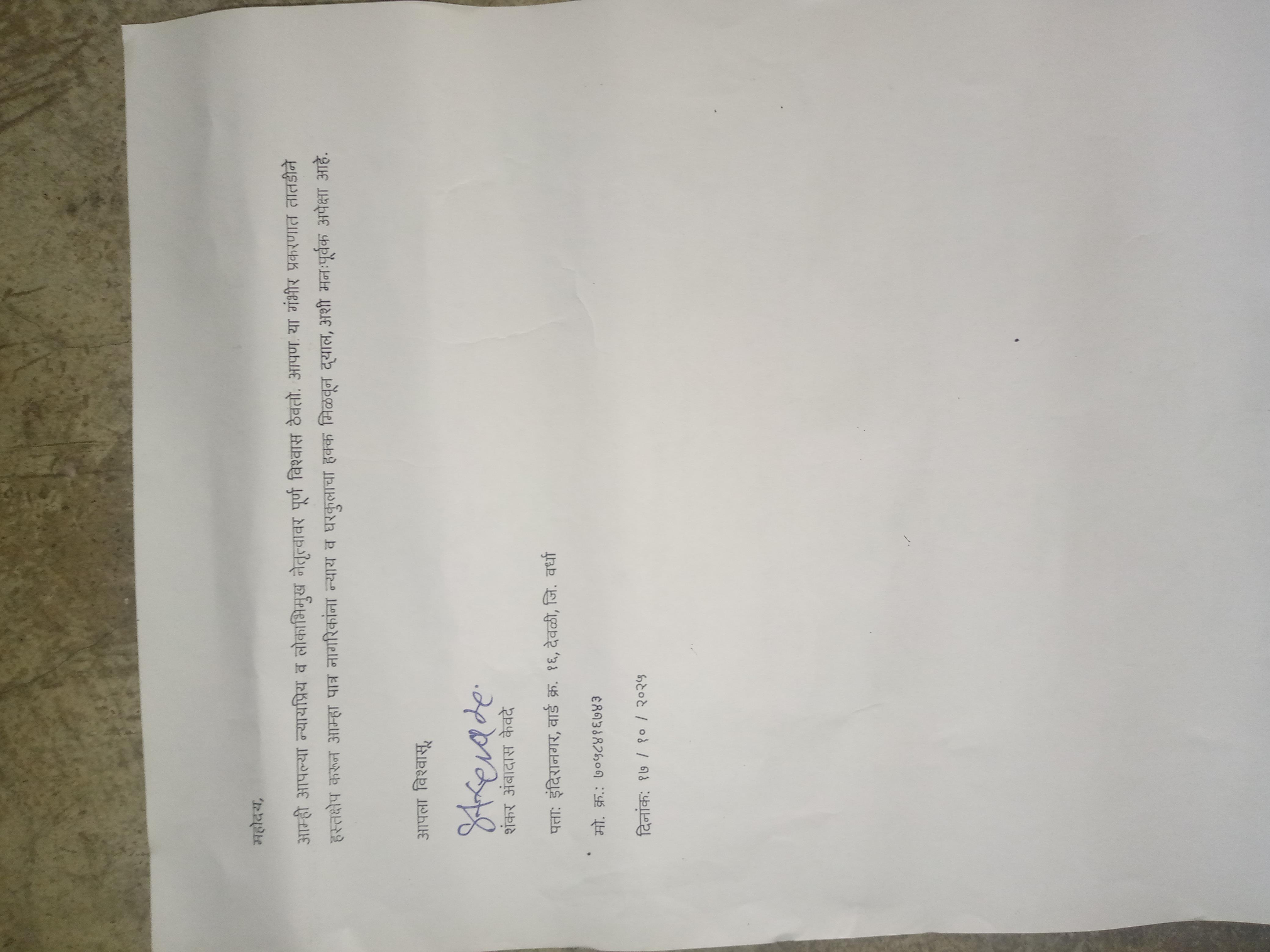 मी खाली सही करणारा शंकर अंबादास केवडे, रा. इंदिरानगर, वार्ड क्र. १६, देवळी, जि. वर्धा — तसेच माझ्यासह आमच्या परिसरातील अनेक नागरिकांनी सन २०१७-१८ मध्ये प्रधानमंत्री आवास योजना (BLC) अंतर्गत अर्ज केले होते. मात्र, आजतागायत आम्हाला या योजनेचा कोणताही लाभ मिळालेला नाही.