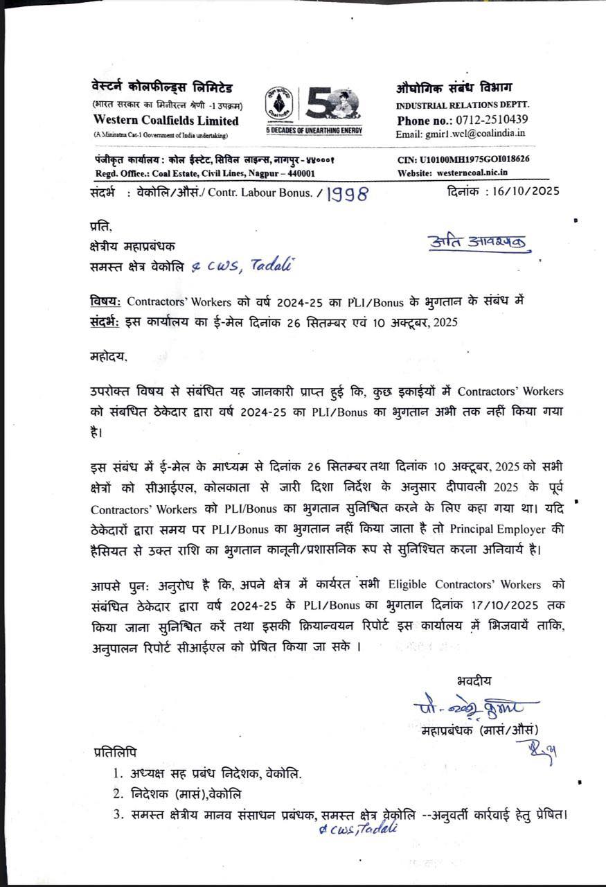 इस संबंध में ई-मेल के माध्यम से दिनांक 26 सितम्बर तथा दिनांक 10 अक्टूबर, 2025 को सभी क्षेत्रों को सीआईएल, कोलकाता से जारी दिशा निर्देश के अनुसार दीपावली 2025 के पूर्व Contractors’ Workers को PLI/Bonus का भुगतान सुनिश्चित करने के लिए कहा गया था। यदि ठेकेदारों द्वारा समय पर PLI/Bonus का भुगतान नहीं किया जाता है तो Principal Employer की हैसियत से उक्त राशि का भुगतान कानूनी/प्रशासनिक रूप से सुनिश्चित करना अनिवार्य है।अपने क्षेत्र में कार्यरत सभी Eligible Contractors’ Workers को संबंधित ठेकेदार द्वारा वर्ष 2024-25 के PLI/Bonus का भुगतान दिनांक 17/10/2025 तक किया जाना सुनिश्चित करें तथा इसकी क्रियान्वयन रिपोर्ट इस कार्यालय में भिजवायें ताकि, अनुपालन रिपोर्ट सीआईएल को प्रेषित किया जा सके।