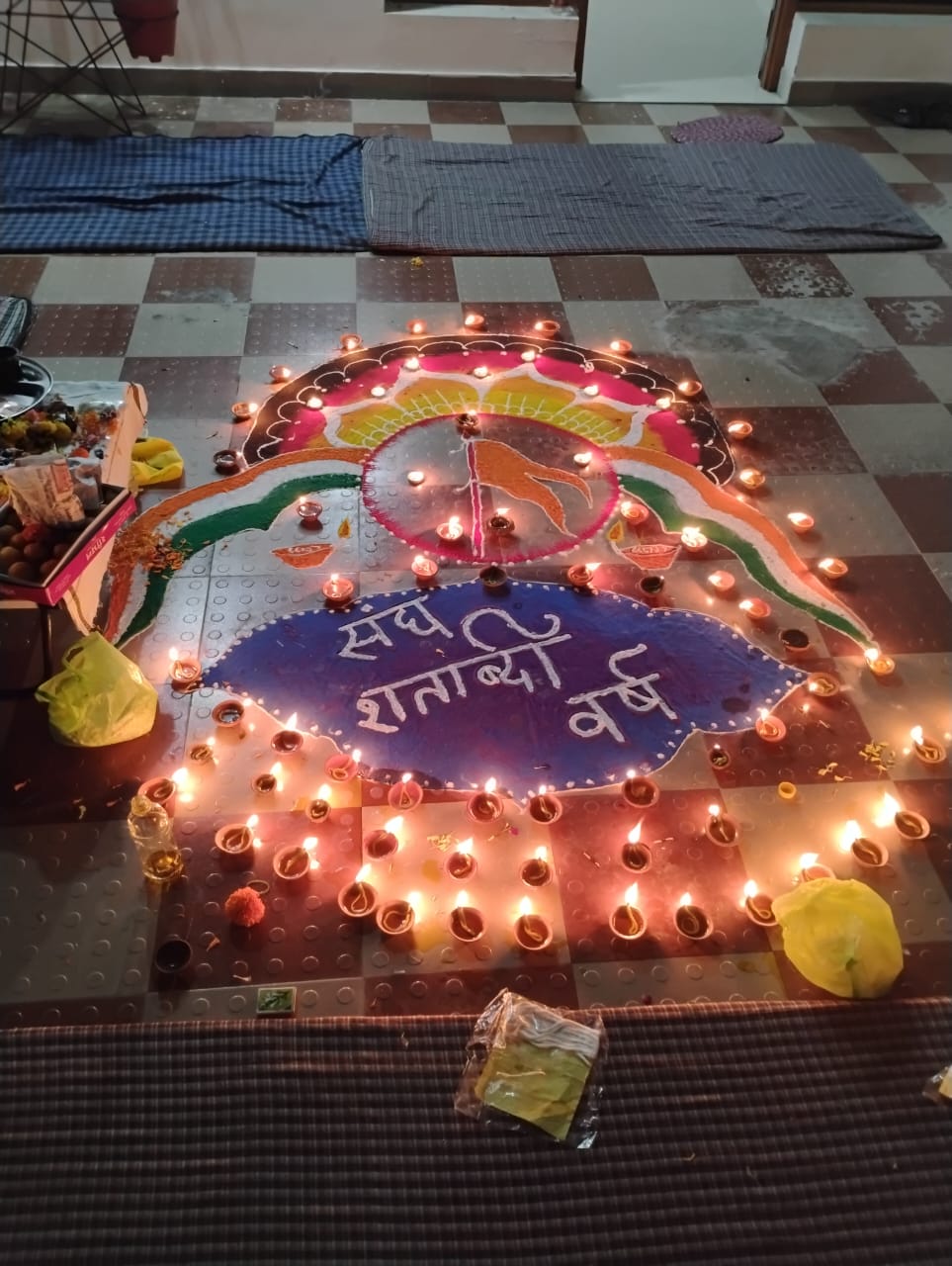 भव्य रंगोली: आयोजन स्थल पर एक अत्यंत आकर्षक और विशाल रंगोली बनाई गई, जैसा कि संलग्न चित्र में देखा जा सकता है। रंगोली में भारतीय ध्वज (तिरंगा) और परम पवित्र भगवाध्वज के रंगों का सुंदर समन्वय था और इसके चारों ओर बड़ी संख्या में मिट्टी के दीये प्रज्वलित किए गए थे।