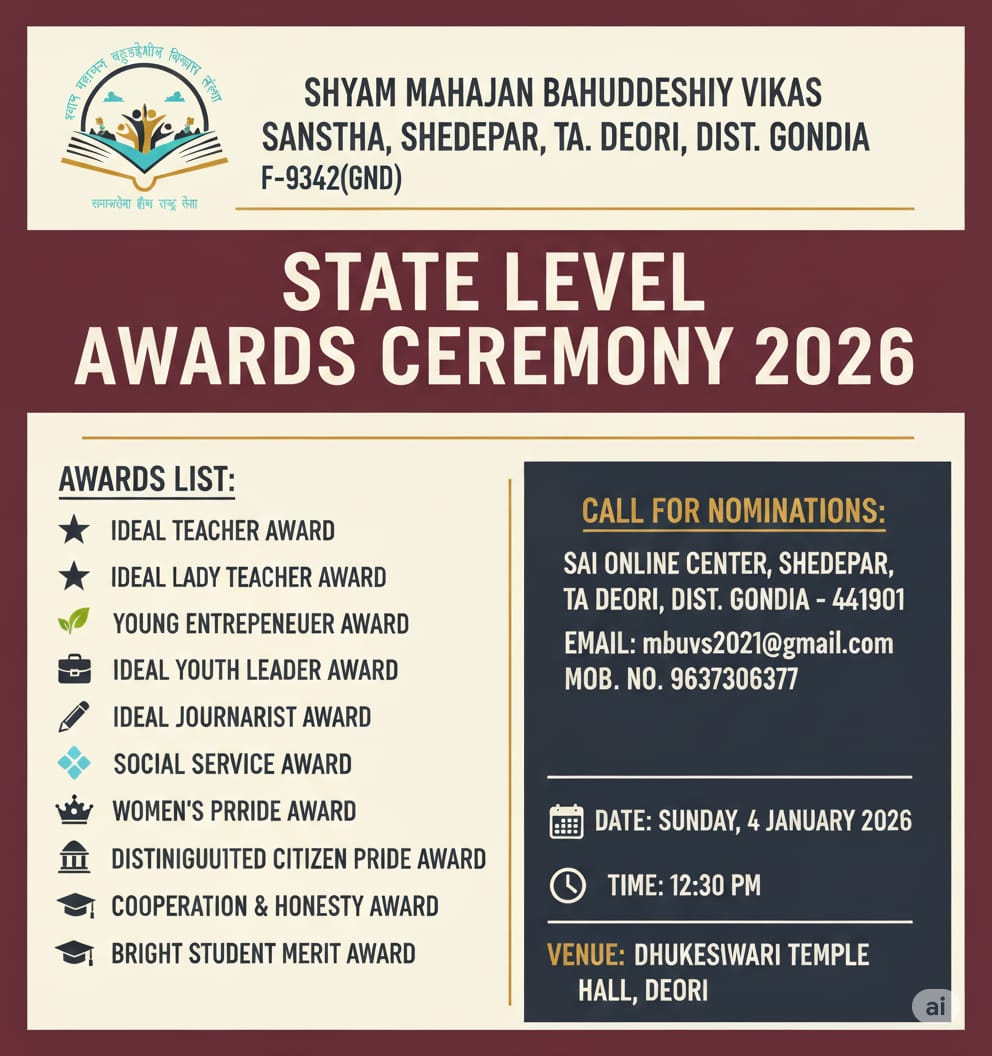 श्याम महाजन बहुद्देशीय विकास संस्था, शेडेपार (नोंदणी क्रमांक F-9342, गोंदिया) यांच्या वतीने राज्यस्तरीय पुरस्कार सोहळा २०२६ आयोजित करण्यात आला आहे. हा सोहळा रविवार, दिनांक ४ जानेवारी २०२६ रोजी दुपारी १२:३० वाजता धुकेस्वरी टेम्पल हॉल, देवरी येथे पार पडणार आहे.