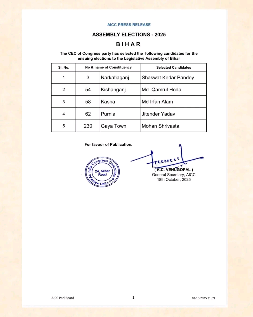 बिहार विधानसभा चुनाव के मद्देनज़र कांग्रेस ने शनिवार को पांच उम्मीदवारों की अपनी दूसरी सूची जारी की है। इस सूची में नरकटियागंज, किशनगंज, कसबा, पूर्णिया और गया टाउन सीटों के उम्मीदवारों के नाम शामिल हैं। पार्टी ने नरकटियागंज से शाश्वत केदार पांडे, पूर्णिया से जीतेन्द्र यादव, गया टाउन से मोहन श्रीवास्तव, कसबा से मोहम्मद इरफान आलम और किशनगंज से मोहम्मद कमरुल हुदा को मैदान में उतारा है।
