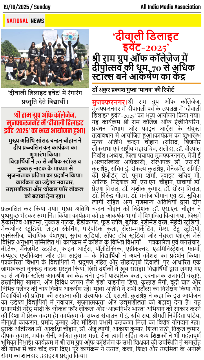 श्री राम ग्रुप ऑफ कॉलेजेज, मुजफ्फरनगर में ‘दीवाली डिलाइट इवेंट-2025’ का भव्य आयोजन हुआ।