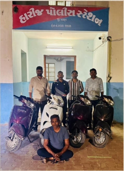 પાટણ પોલીસ અધિક્ષકશ્રી, વી.કે.નાથી સાહેબ, પાટણ તથા નાયબ પોલીસ અધિક્ષકશ્રી, ડી.ડી.ચૌધરી સાહેબ, રાધનપુર વિભાગ નાઓએ મિલ્કત સબંધી ગુનાઓ શોધી કાઢવા સુચના કરેલ હોઈ જેથી પોલીસ ઇન્સપેક્ટર એન.એ.શાહ હારીજનાઓના સીધા માર્ગદર્શન હેઠળ હારીજ ડી-સ્ટાફ ટીમના માણસો પો.સ્ટે. વિસ્તારમાં પેટ્રોલિંગમાં હતા તે દરમ્યાન ખાનગી રાહે હકીકત મળેલ કે એક ઇસમ આર.ટી.ઓરજી.નંબર. GJ.01.JV.7136. નું ચોરીનું એક્ટિવા લઈ પાટણ રોડ તરફ થી હારીજ તરફ આવી રહેલ છે જે હકીકત આધારે હારીજ સંતસગંધામ નજીક રોડ ઉપર પ્રાઇવેટ વાહન સાથેના કાબંધીમાં દરમ્યાન એક લાલ કલરના એકટીવા રજી.નં- GJ.01.JV.7136ની સાથે એક ઇસમને પકડી પાડી જે ઇસમને સદર એક્ટીવા બાબતે યુક્તિ-પ્રયુક્તિથી પૂછપરછ કરતા સદર એકટીવા પાલનપુર મુકામેથી ચોરી કરી લાવેલ હોવાની હકીકત જણાવેલ હોઈ જે ઇસમ વિરૂધ્ધમાં કાર્યવાહી કરી સદરી ઇસમને પોલીસ સ્ટેશન લાવી વધુ તપાસ કરતા તેને મહેસાણા જીલ્લામાં અલગ અલગ જગ્યાએથી ત્રણ એક્ટીવા ચોરી કરેલ હોવાની કબુલાત કરેલ હોય જે ત્રણેય એકટીવા તેની પાસેથી કબ્જે કરી એક્ટીવાઓ બાબતે તપાસ કરતા એક્ટીવા રજી.નં- GJ.02.CE.5583.ના કામે ઉંઝા પોલીસ સ્ટેશન ખાતે ગુ.ર.નં-૧૧૨૦૬૦૩૩૨૫૦૬૧૧/૨૦૨૫ બી.એન.એસ કલમ ૩૦૩(૨) મુજબ તથા એક્ટીવા રજી નં- GJ.02.BN.2334 ના કામે મહેસાણા સીટી બી ડીવીઝન પોલીસ સ્ટેશન