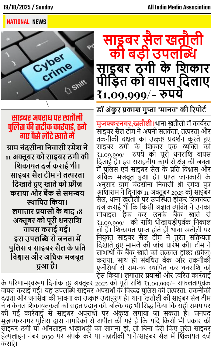थाना खतौली में कार्यरत साइबर सैल टीम ने अपनी सतर्कता, तत्परता और तकनीकी दक्षता का उत्कृष्ट प्रदर्शन करते हुए साइबर ठगी के शिकार एक व्यक्ति को ₹1,09,999/- रुपये की पूरी धनराशि वापस दिलाई है। इस सराहनीय कार्य से क्षेत्र की जनता में पुलिस एवं साइबर सैल के प्रति विश्वास और अधिक मजबूत हुआ है। प्राप्त जानकारी के अनुसार ग्राम चंदसीना निवासी श्री रमेश पुत्र आशाराम ने दिनांक 11 अक्तूबर 2025 को साइबर सैल, थाना खतौली पर उपस्थित होकर शिकायत दर्ज कराई थी कि किसी अज्ञात व्यक्ति ने उनका मोबाइल हैक कर उनके बैंक खाते से ₹1,09,999/- की राशि धोखाधड़ीपूर्वक निकाल ली है। शिकायत प्राप्त होते ही थाना खतौली पर नियुक्त साइबर सैल टीम ने तुरंत सक्रियता दिखाते हुए मामले की जांच प्रारंभ की। टीम ने लाभार्थी के बैंक खाते को तत्काल होल्ड (फ्रीज़) कराया, साथ ही संबंधित बैंक और तकनीकी एजेंसियों से समन्वय स्थापित कर धनराशि को ट्रेस किया। लगातार प्रयासों और त्वरित कार्रवाई के परिणामस्वरूप दिनांक 18 अक्तूबर 2025 को पूरी राशि ₹1,09,999/- सफलतापूर्वक वापस कराई गई। यह उपलब्धि साइबर अपराधों के विरुद्ध पुलिस की तत्परता, तकनीकी दक्षता और जनसेवा की भावना का उत्कृष्ट उदाहरण है। थाना खतौली की साइबर सैल टीम ने न केवल शिकायतकर्ता को राहत प्रदान की, बल्कि यह भी सिद्ध किया कि सही समय पर की गई कार्रवाई से साइबर अपराधों पर अंकुश लगाया जा सकता है। जनपद मुज़फ्फरनगर पुलिस द्वारा नागरिकों से अपील की गई है कि यदि किसी भी प्रकार की साइबर ठगी या ऑनलाइन धोखाधड़ी का सामना हो, तो बिना देरी किए तुरंत साइबर हेल्पलाइन नंबर 1930 पर संपर्क करें या नज़दीकी थाने/साइबर सैल में शिकायत दर्ज कराएं।