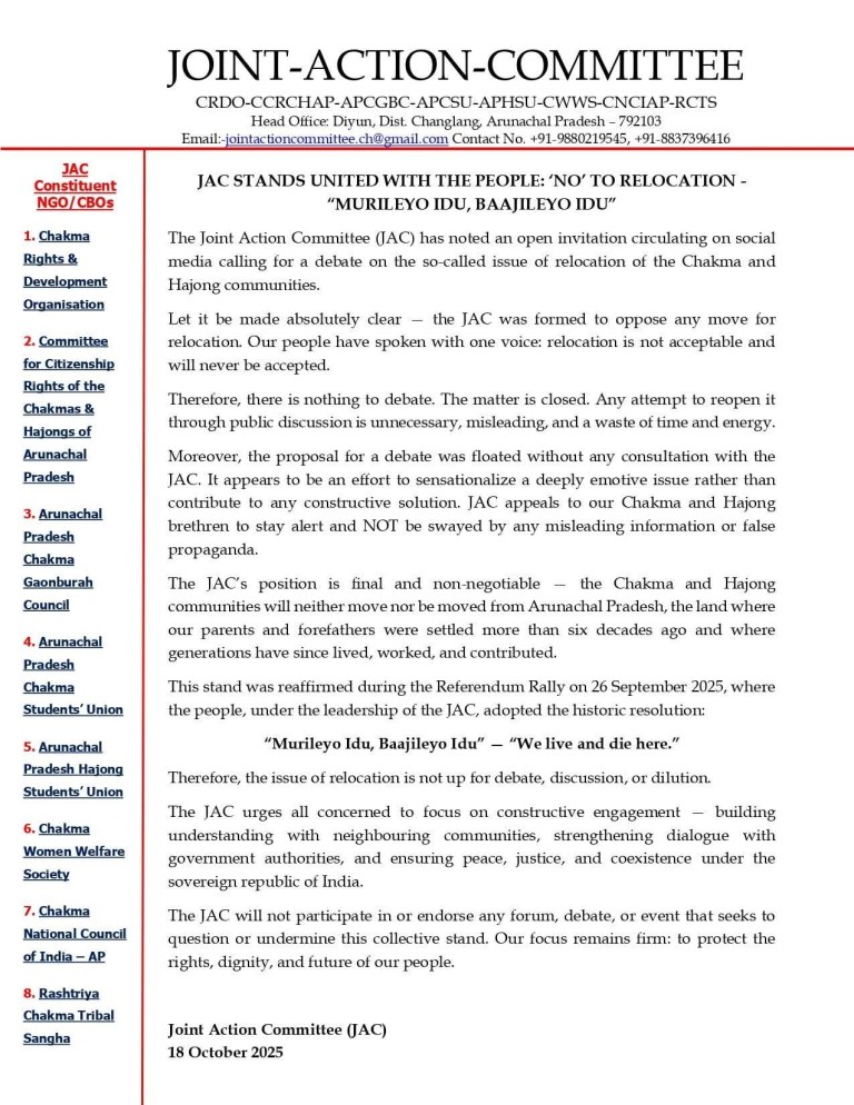 The Joint Action Committee (JAC), representing major Chakma and Hajong organizations in Arunachal Pradesh, has strongly opposed the recent social media call for a debate on the relocation of the Chakma and Hajong communities.