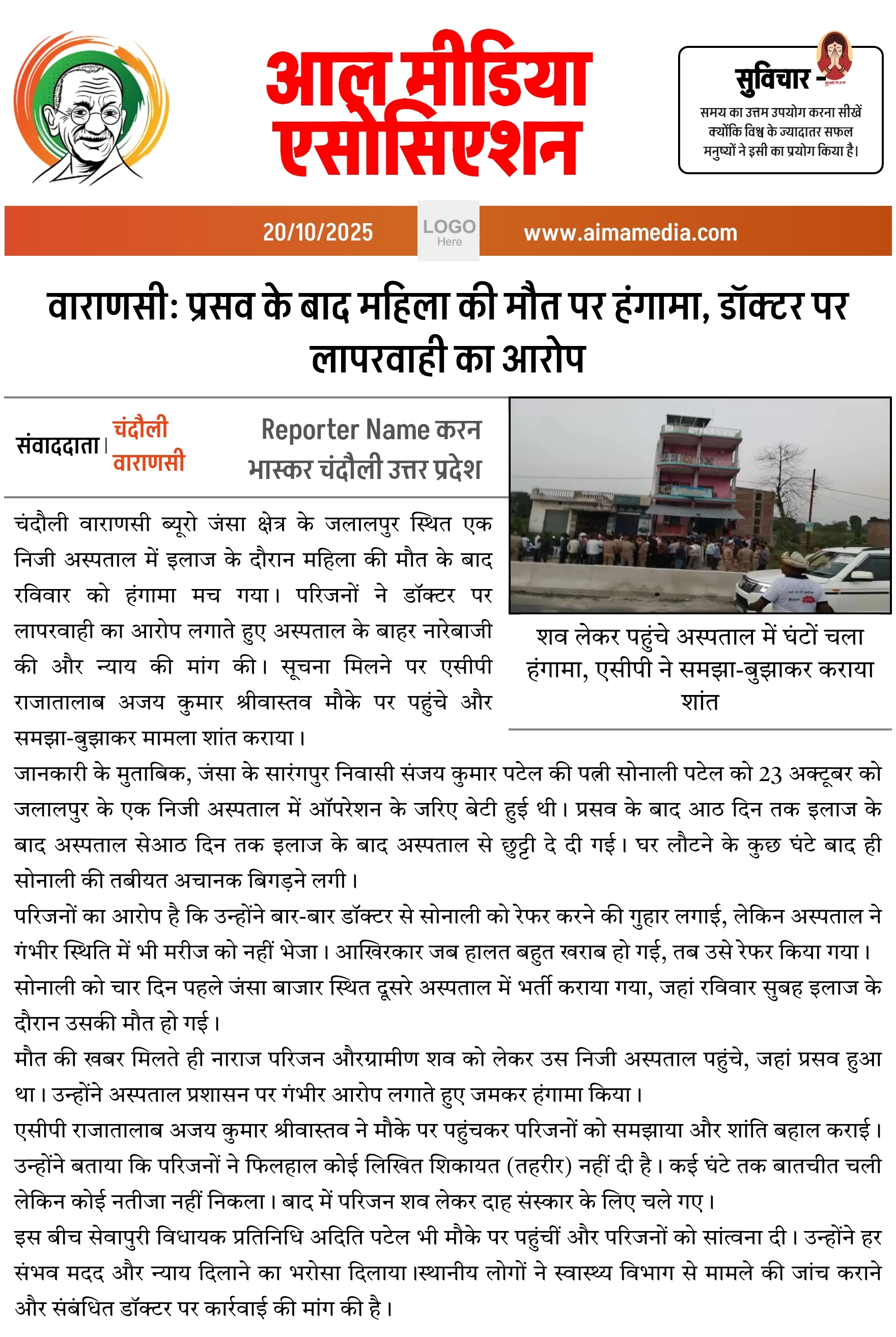 जानकारी के मुताबिक, जंसा के सारंगपुर निवासी संजय कुमार पटेल की पत्नी सोनाली पटेल को 23 अक्टूबर को जलालपुर के एक निजी अस्पताल में ऑपरेशन के जरिए बेटी हुई थी। प्रसव के बादछुट्टी दे दी गई। घर लौटने के कुछ घंटे बाद ही सोनाली की तबीयत अचानक बिगड़ने लगी।