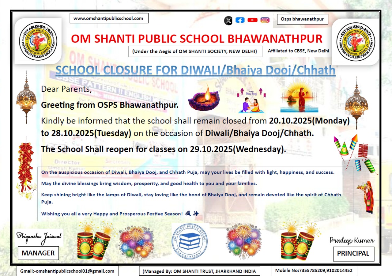 विद्यालय के प्रबंधक श्री प्रियांशु जायसवाल एवं प्राचार्य श्री प्रदीप कुमार ने सभी बच्चों एवं अभिभावकों को सूचित किया है कि विद्यालय में दिनांक 20 अक्टूबर (सोमवार) से 28 अक्टूबर (मंगलवार) तक अवकाश रहेगा।