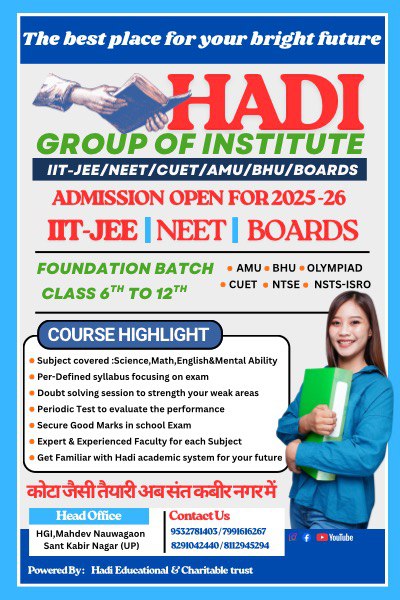 आपके बच्चों के बेहतर शिक्षा के लिए आप के कस्बे में हादी ग्रुप ऑफ इंस्टीट्यूट में मेडिकल (NEET -UG) & इंजीनियरिंग (IIT -JEE) की तैयारी अनुभवी टीचरों के माध्यम से कराया जाता है । आपके बच्चों के एडमिशन के लिए आज ही संपर्क करे ।