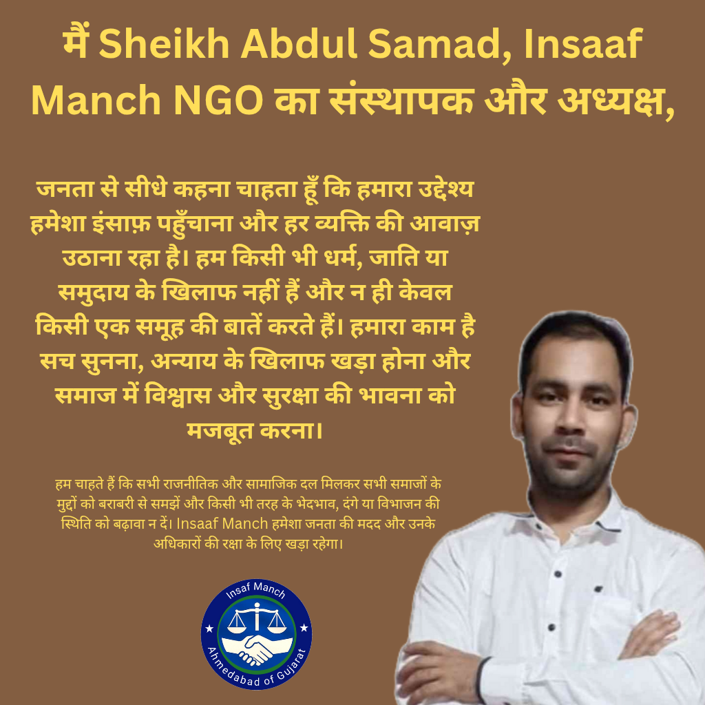 मैं Sheikh Abdul Samad, Insaaf Manch का संस्थापक और अध्यक्ष, जनता से सीधे कहना चाहता हूँ कि हमारा उद्देश्य हमेशा इंसाफ़ पहुँचाना और हर व्यक्ति की आवाज़ उठाना रहा है। हम किसी भी धर्म, जाति या समुदाय के खिलाफ नहीं हैं और न ही केवल किसी एक समूह की बातें करते हैं। हमारा काम है सच सुनना, अन्याय के खिलाफ खड़ा होना और समाज में विश्वास और सुरक्षा की भावना को मजबूत करना।
