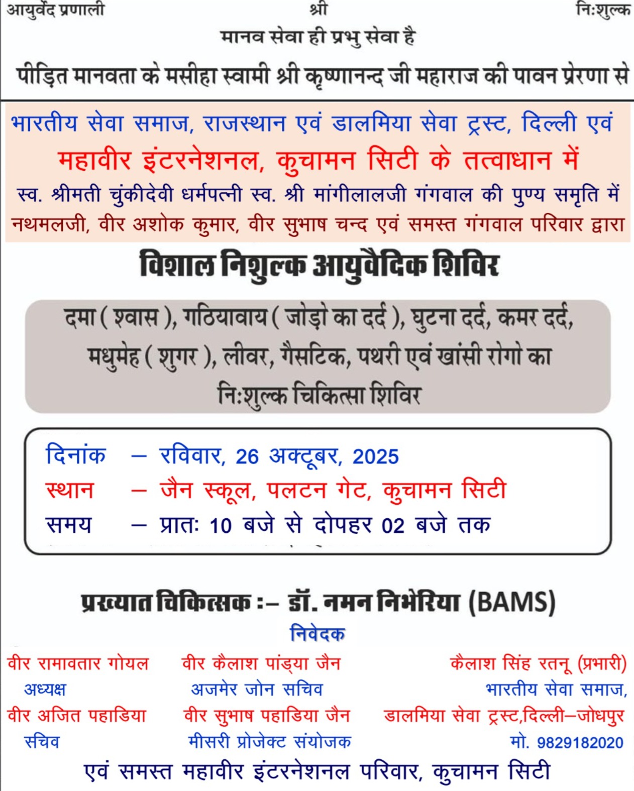 कुचामन सिटी:-महावीर इंटरनेशनल, कुचामन सिटी वीर सुभाष पहाडिया, वीर कैलाश चन्द पांड्या के अनुसार स्वर्गीय चूकी देवी धर्मपत्नी स्वर्गीय श्री मांगीलाल जी गंगवाल की पुण्य स्मृति में नथमलजी , वीरा सीता,वीर अशोक कुमार, वीर सुभाष चन्द गंगवाल परिवार व भारतीय सेवा समाज, राजस्थान व डालमिया ट्रस्ट, दिल्ली के कैलाश रतनू प्रभारी द्वारा दिनांक 26 अक्टूबर 2025, रविवार को जैन स्कूल, पलटन गेट में निशुल्क आयुर्वेदिक चिकित्सा शिविर का आयोजन किया जा रहा है, जिसमें डॉक्टर नमन निभेरिया ( B A M S ) द्वारा दमा (श्वास), गठियावाय (जोड़ों का दर्द), कमर दर्द, शुगर, लीवर, गैस्ट्रिक, पथरी एवं खांसी रोगों का निशुल्क परामर्श के साथ एक माह की दवा भी नि: शुल्क दी जाएगा