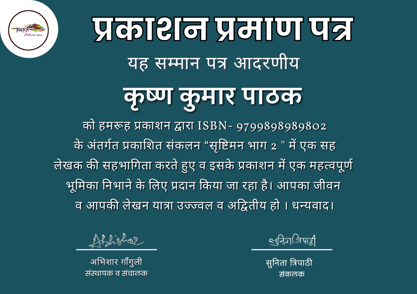 पुस्तक लेखन के साझा संकलन में हमरूह प्रकाश द्वारा सृष्टि मन भाग2 का सहलेखक प्रमाण पत्र संकलन सुनीता त्रिपाठी द्वारा प्रदान किया गया।